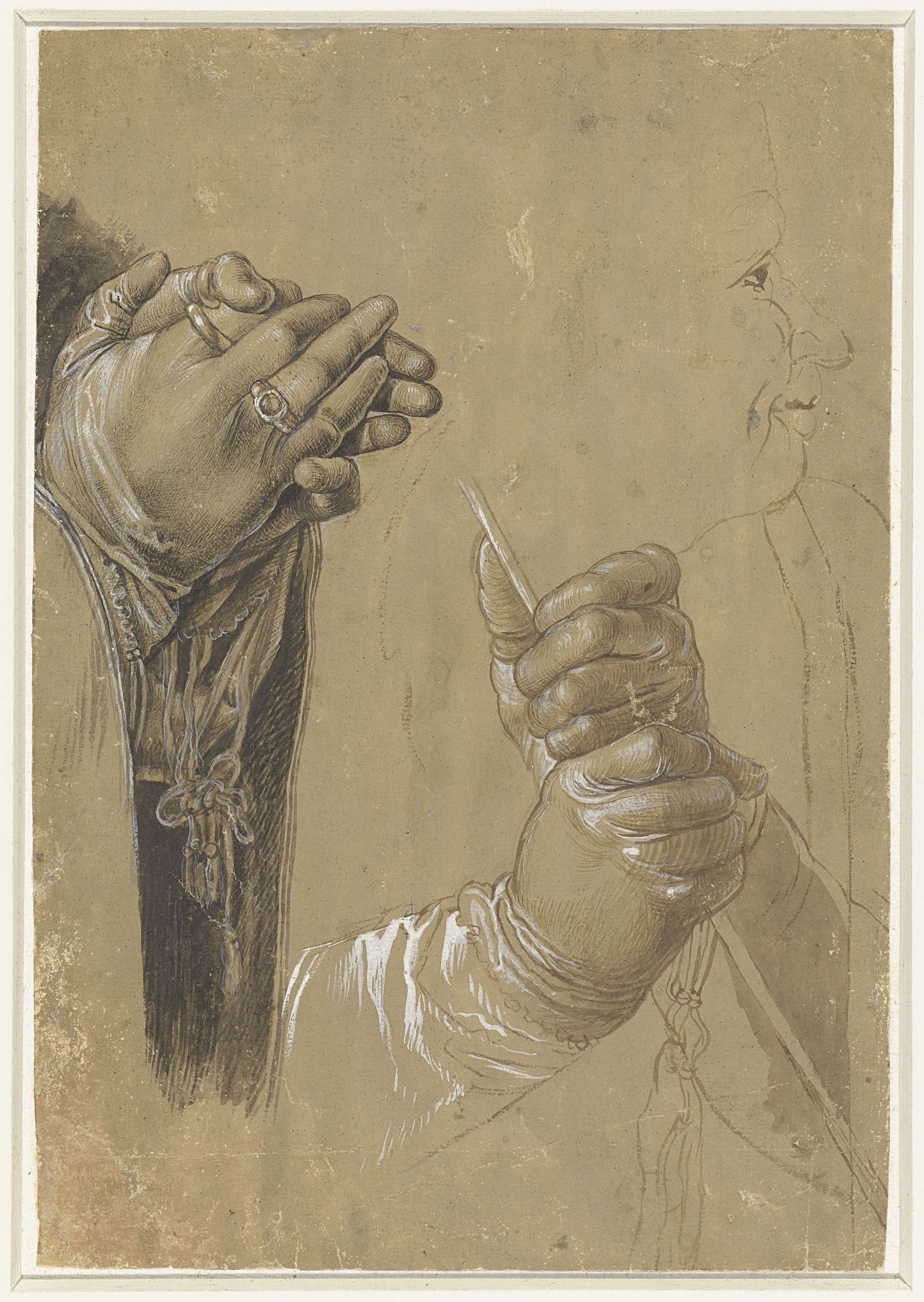 Detailstudie van de handen van kardinaal Guniani op het Rozenkranzfest; twee andere handen die een stok houden, en een vluchtig geschetste profielkop.