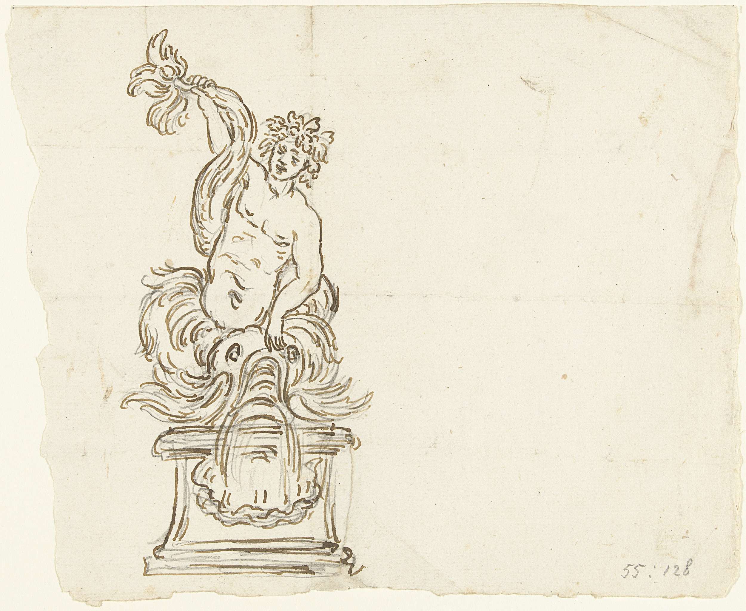 Tuinsculptuur met een zeegod die een dolfijn ophoudt
