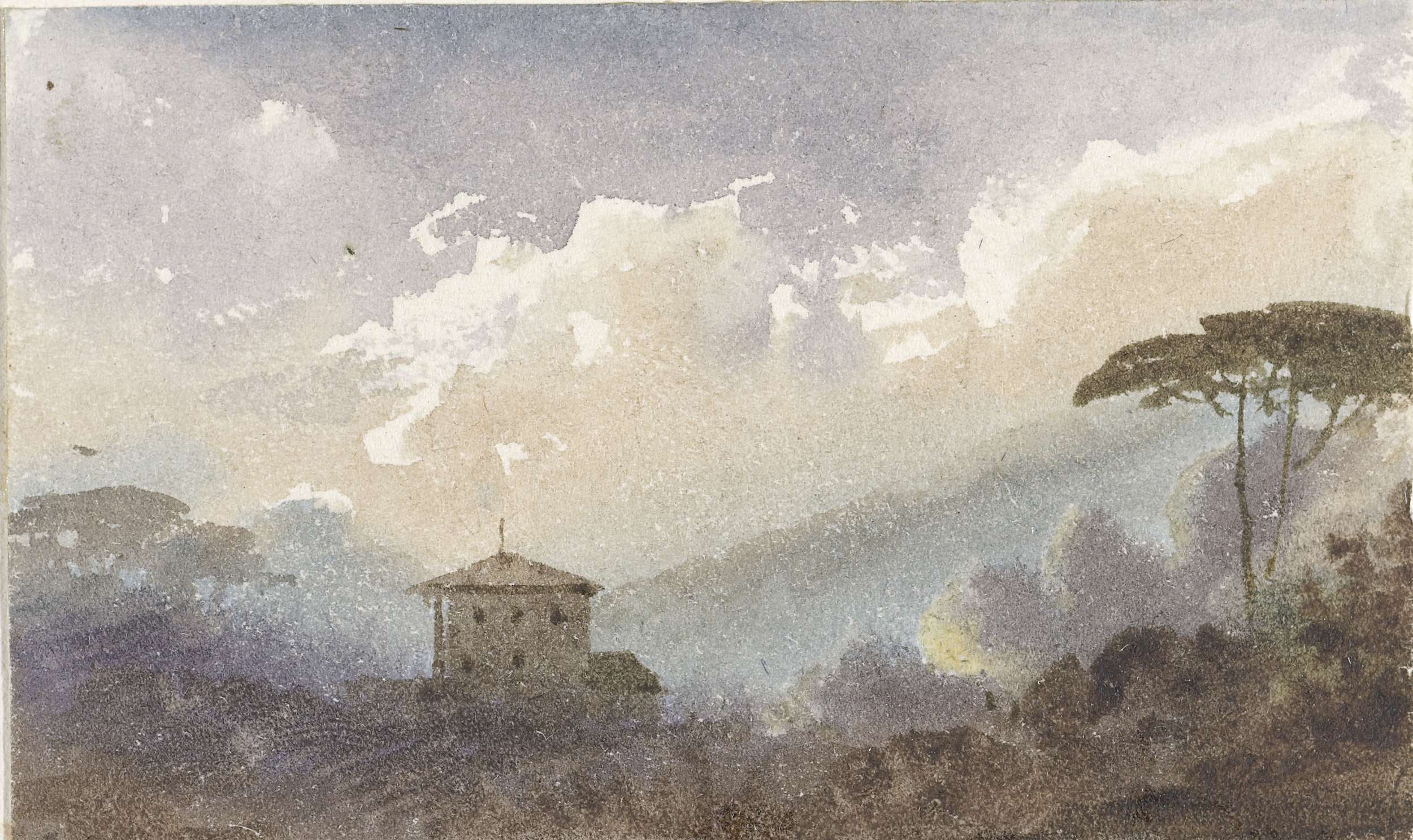 Albumblaadje met een landhuis met brede toren tussen de bossen in een berglandschap.