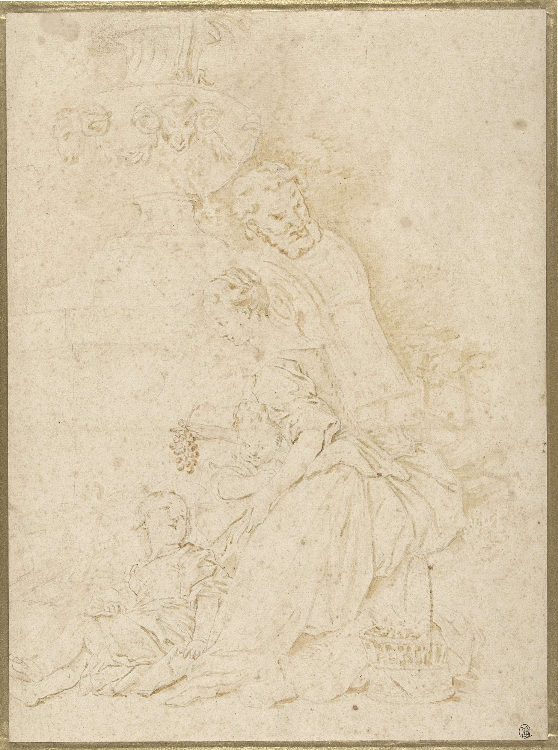 Een jonge vrouw houdt een tros druiven op voor twee kinderen, onder een siervaas, waarnaast een herme van Bacchus staat. Naar een detail van Boucher's ontwerp voor "La Danse".