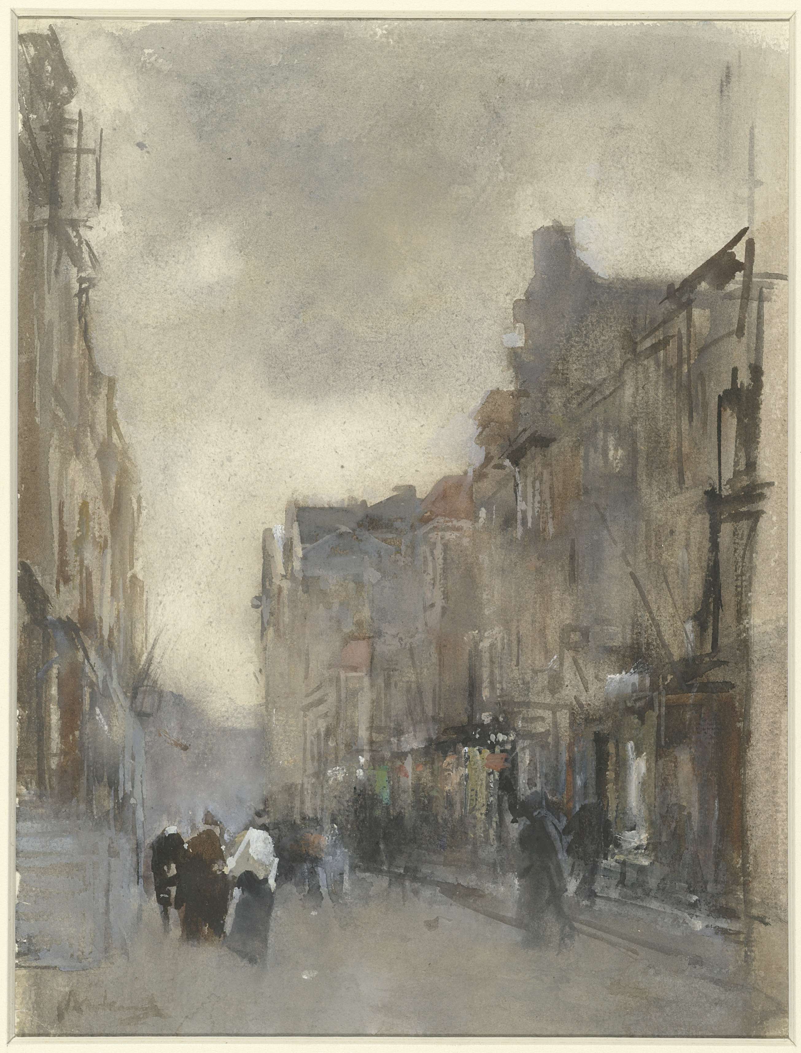 Straatgezicht met enkele voetgangers, schetsmatig weergegeven.
