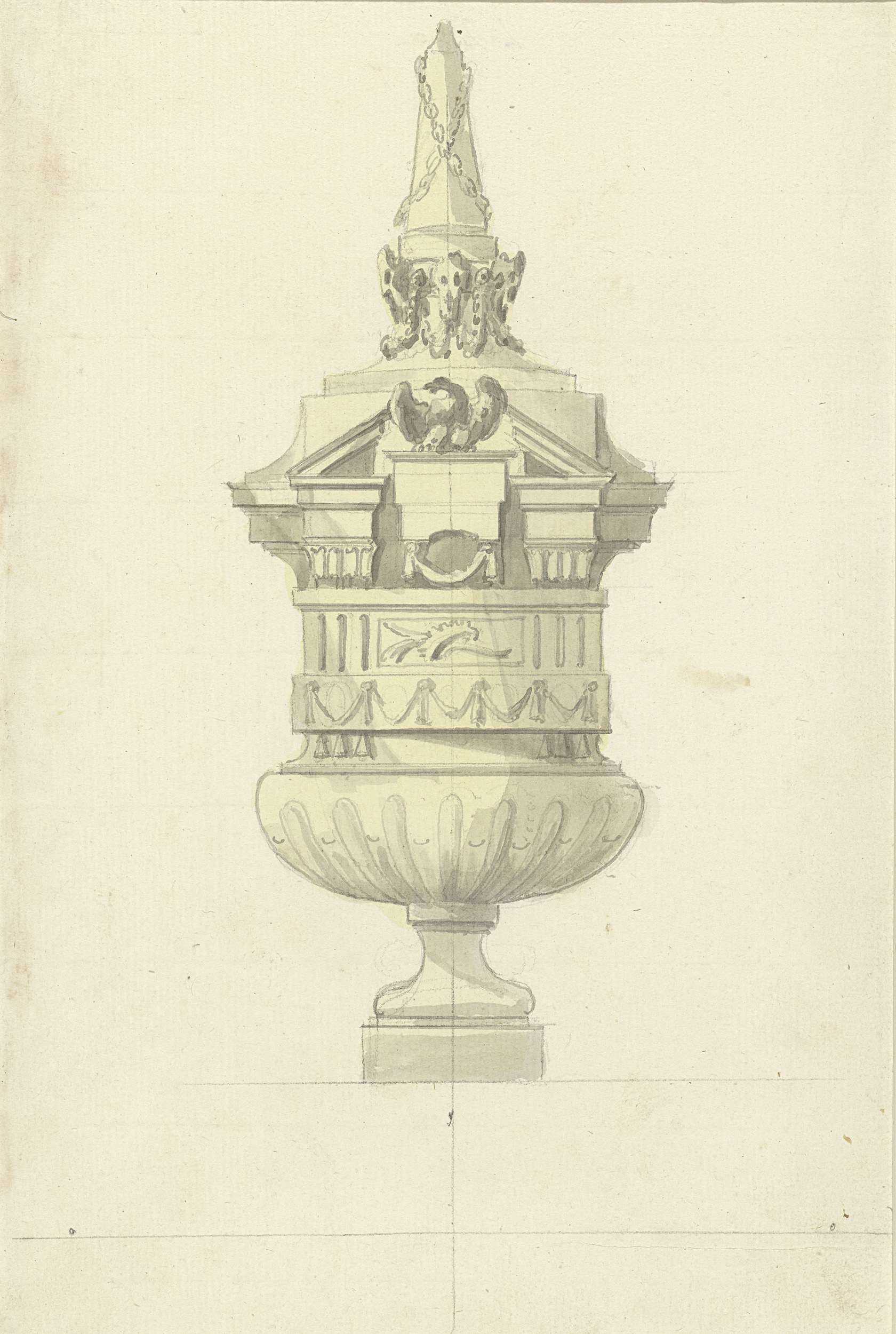 Siervaas, waarvan de bovenzijde als architectuur bekroond wordt met een gebroken timpaan, waarin een adelaar is opgesteld.