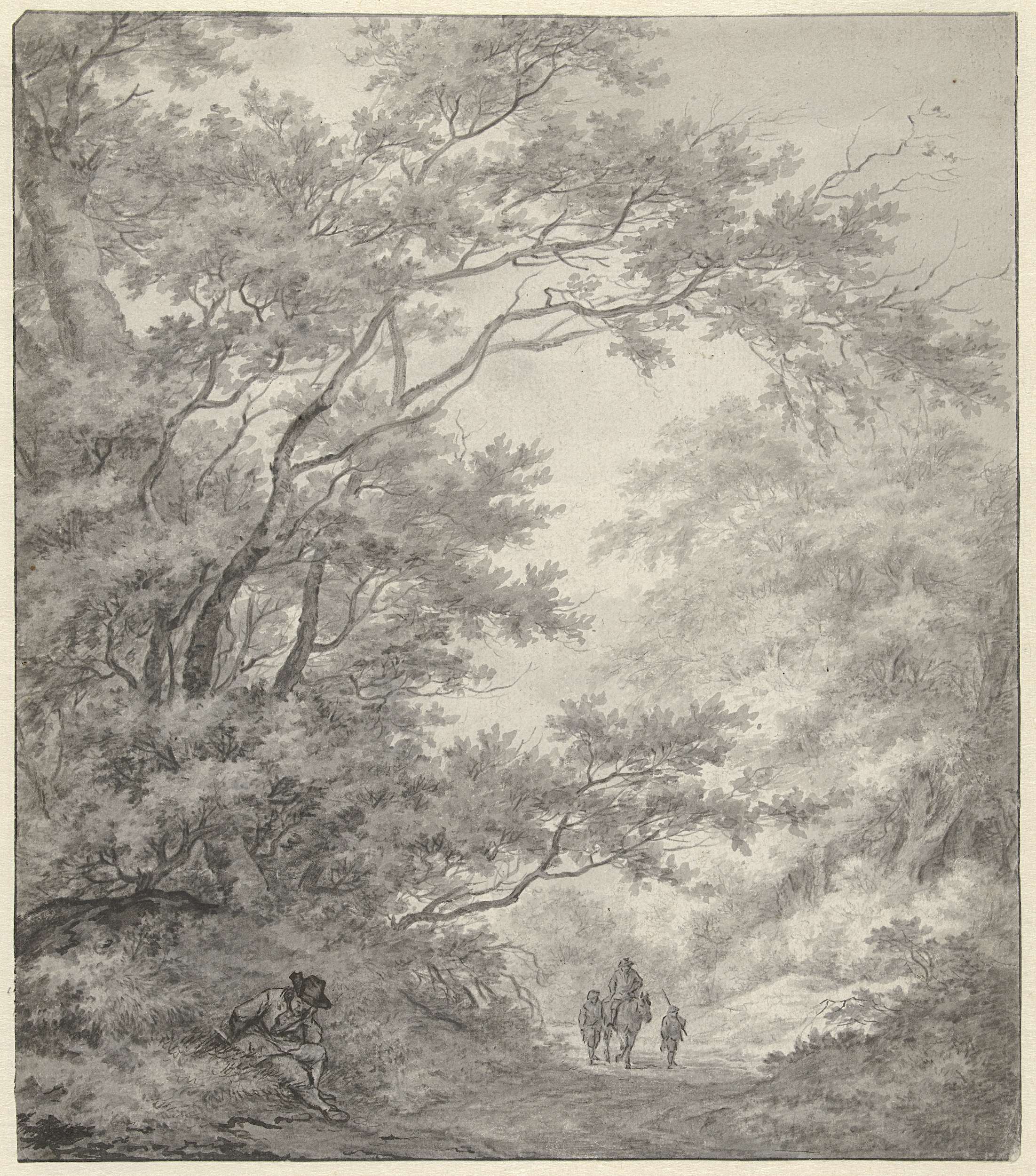 Weg in een bosachtige streek, waarop drie reizigers naderen