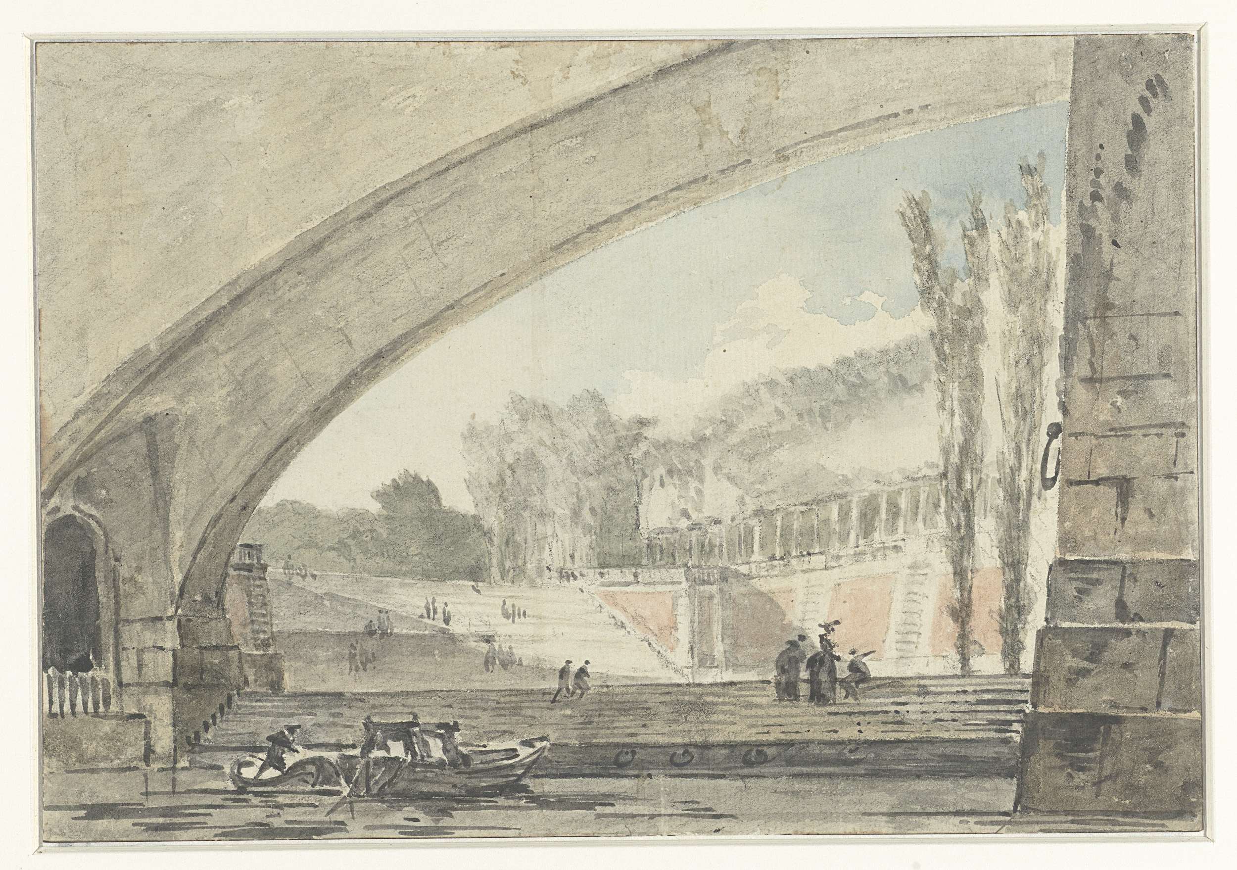 Doorzicht onder een brug naar terrassen en een trap, waarop groepjes wandelaars.