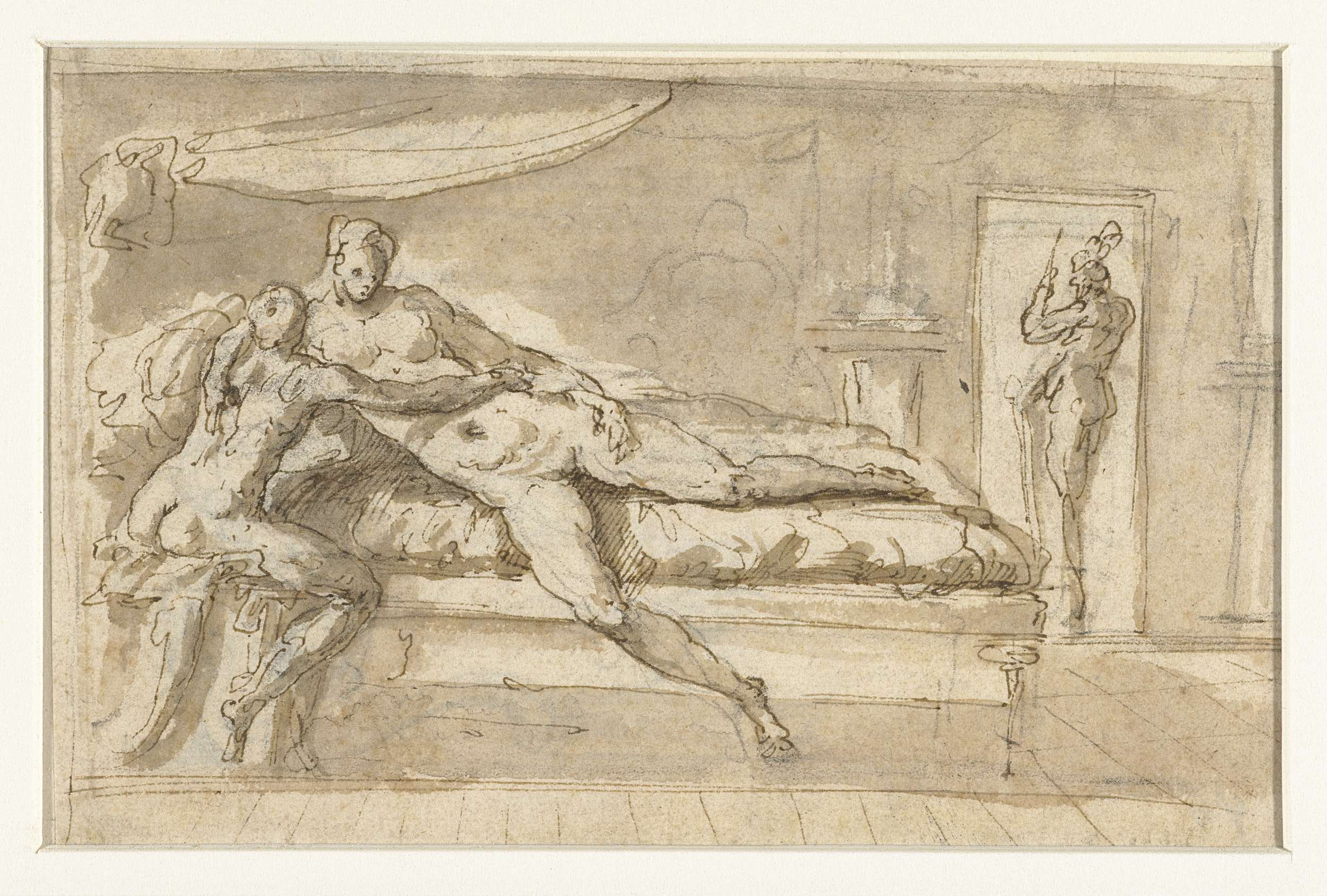 Amor en Psyche in een vertrek waar een schildwacht in de deuropening staat.