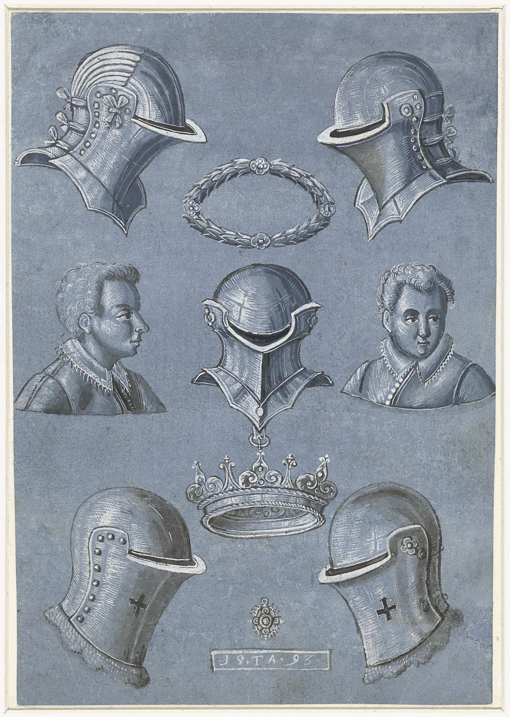 Blad met vijf helmen, een kroon, een lauwerkrans en twee bustes van jongelingen