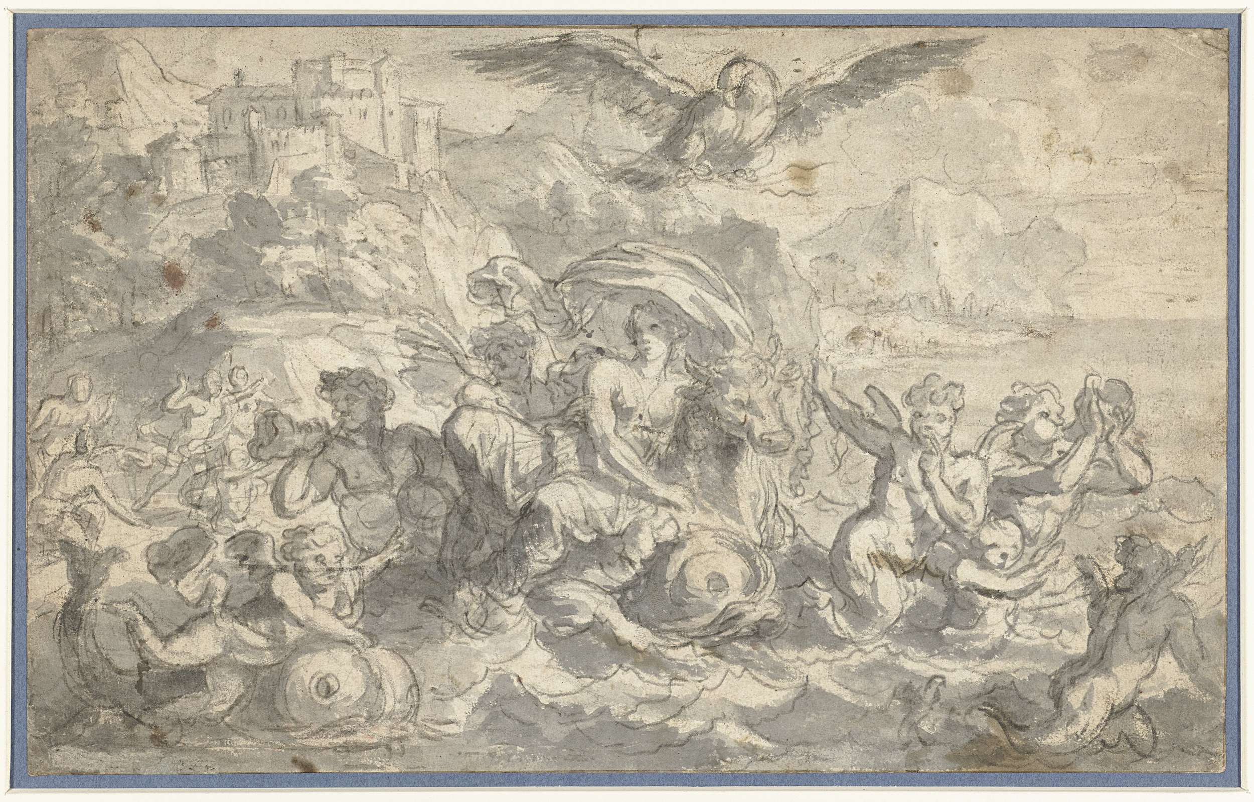 Europa, door de stier weggevoerd en omgeven door zeegoden; boven haar zweeft Jupiter in de gedaante van een bliksemdragende adelaar.