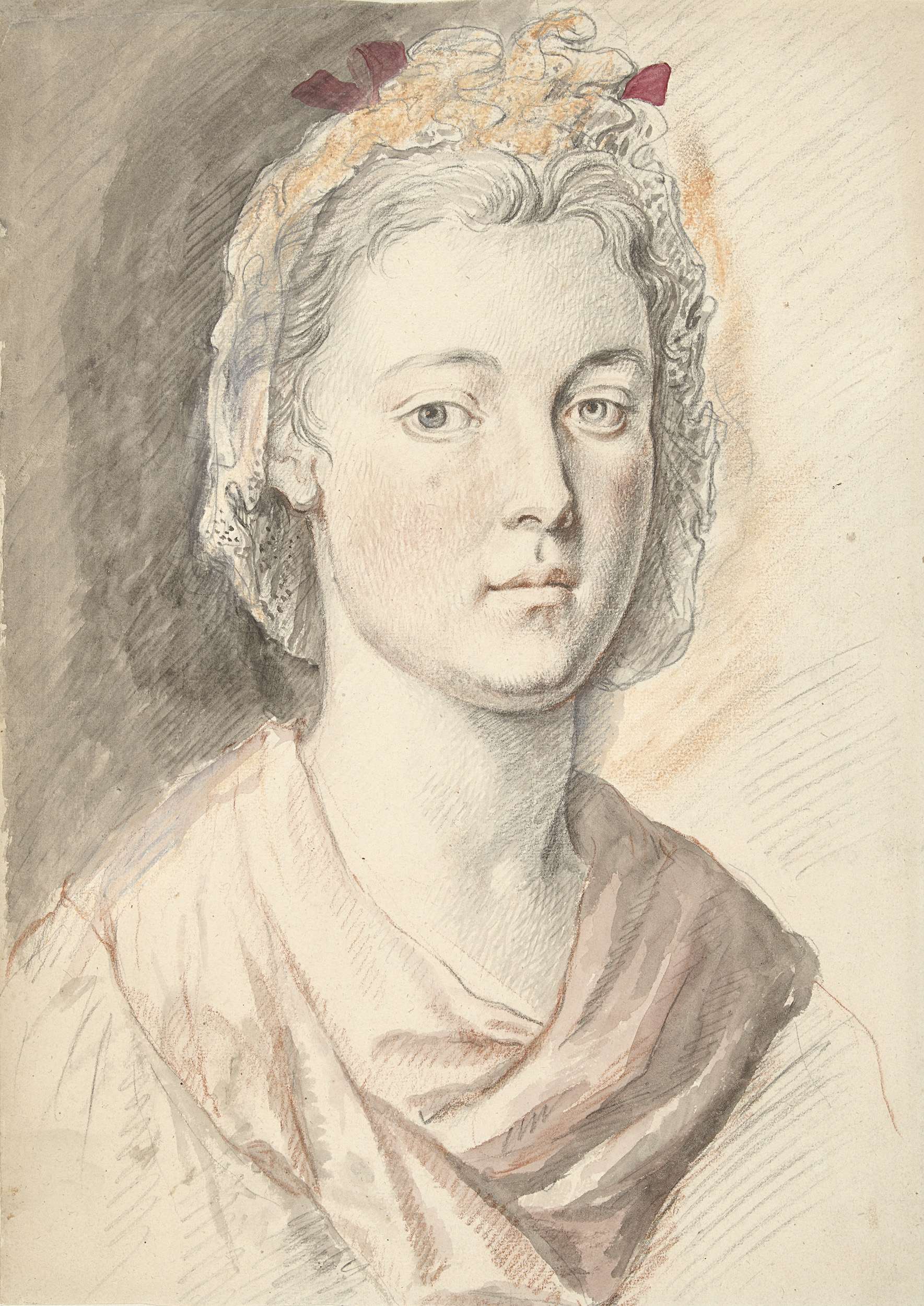Portret van een jonge vrouw met een roze fichu om de hals en een kapje met rode linten, op het korte haar.