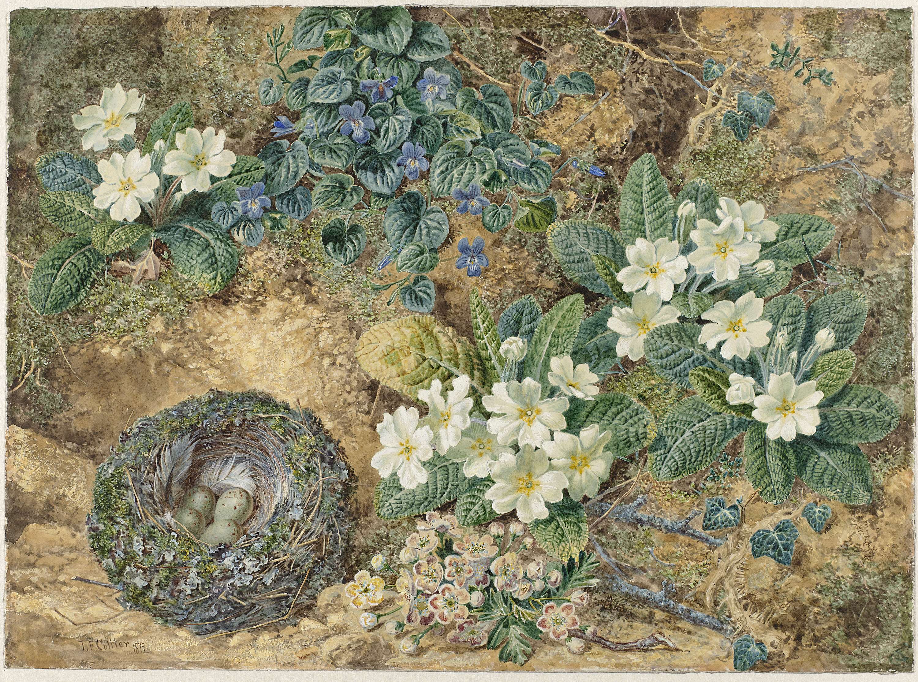 Stilleven van een vogelnestje, viooltjes, primula's en appelbloesem