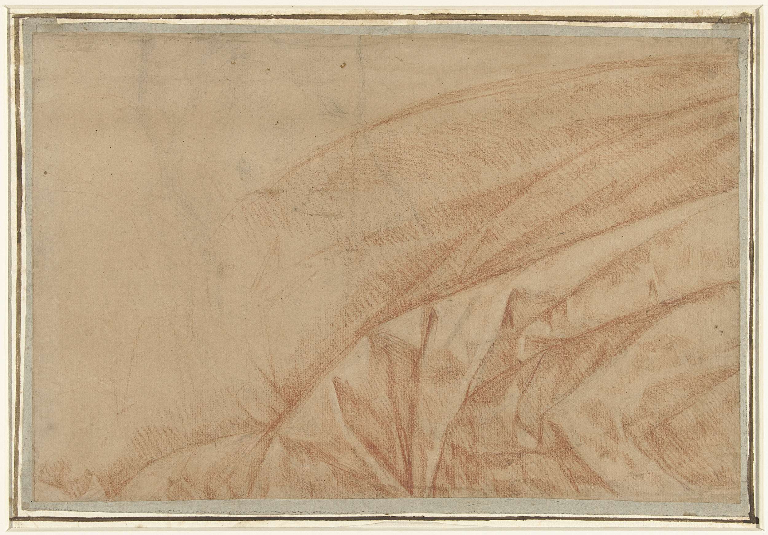 Studie van een hangend gordijn; over een lichte schets van een naakte mannelijke torso.