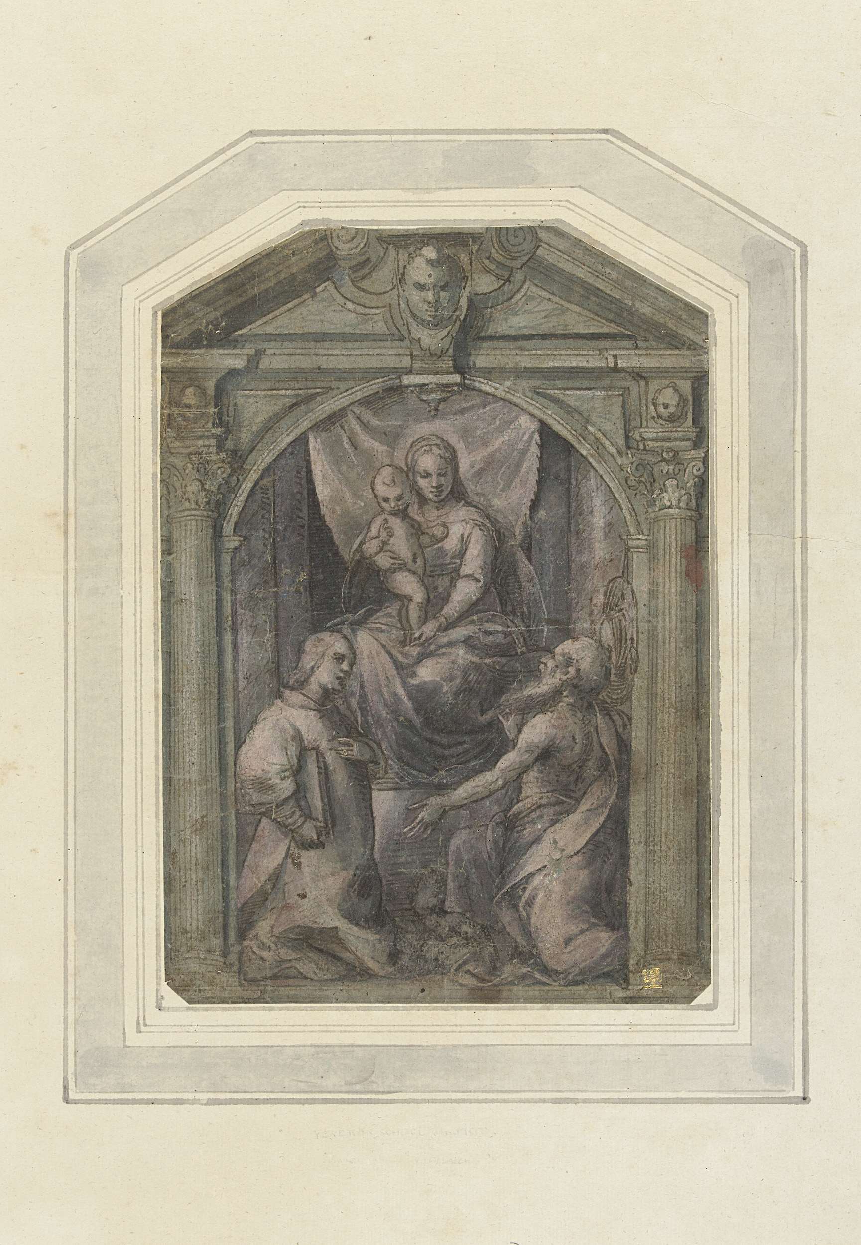 Ontwerp voor een altaarstuk met een tronende Madonna aanbeden door twee heiligen.