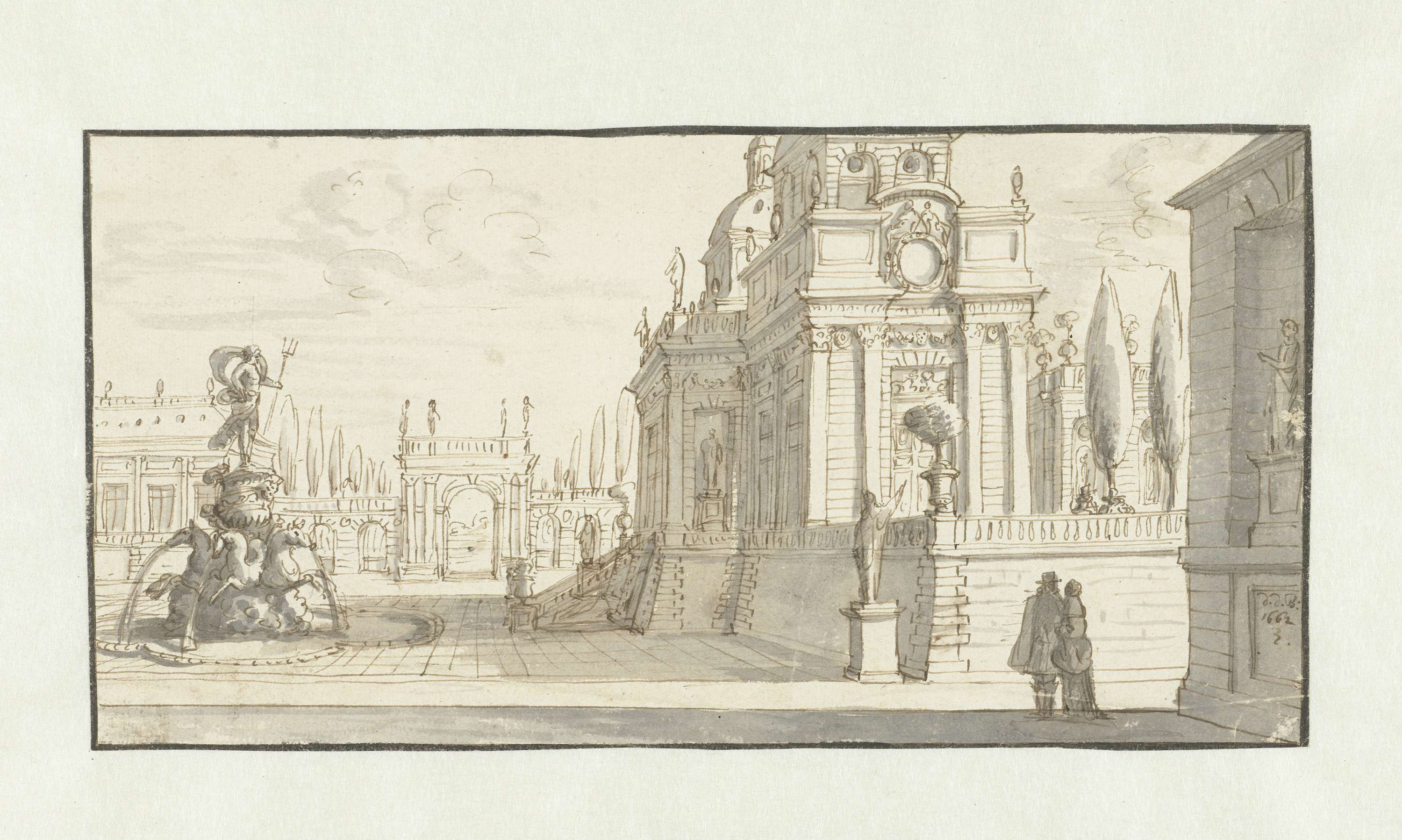Plein voor een renaissancepaleis met links een Neptunusfontein.