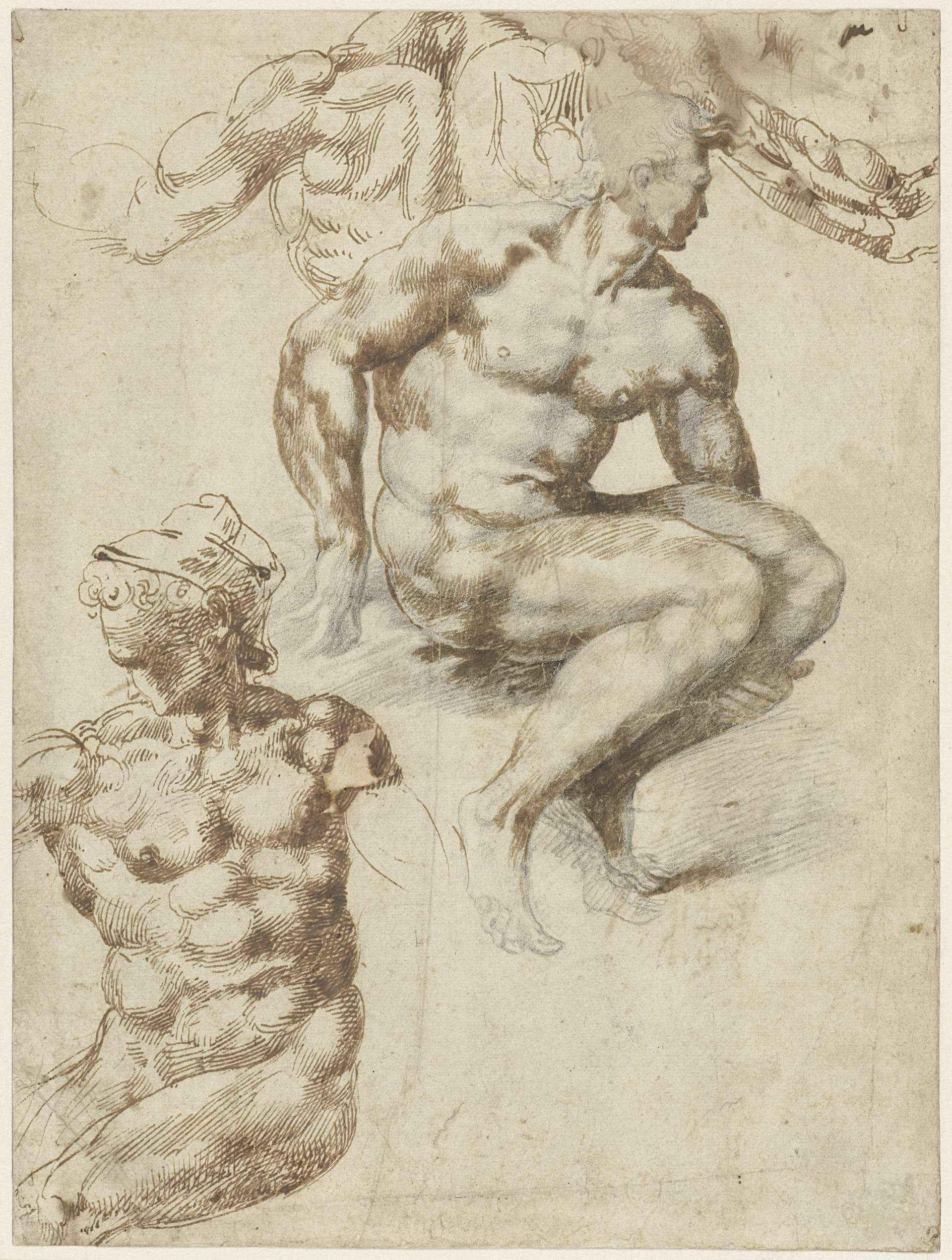 Studieblad met twee zittende naakten en een detailstudie van een rug.