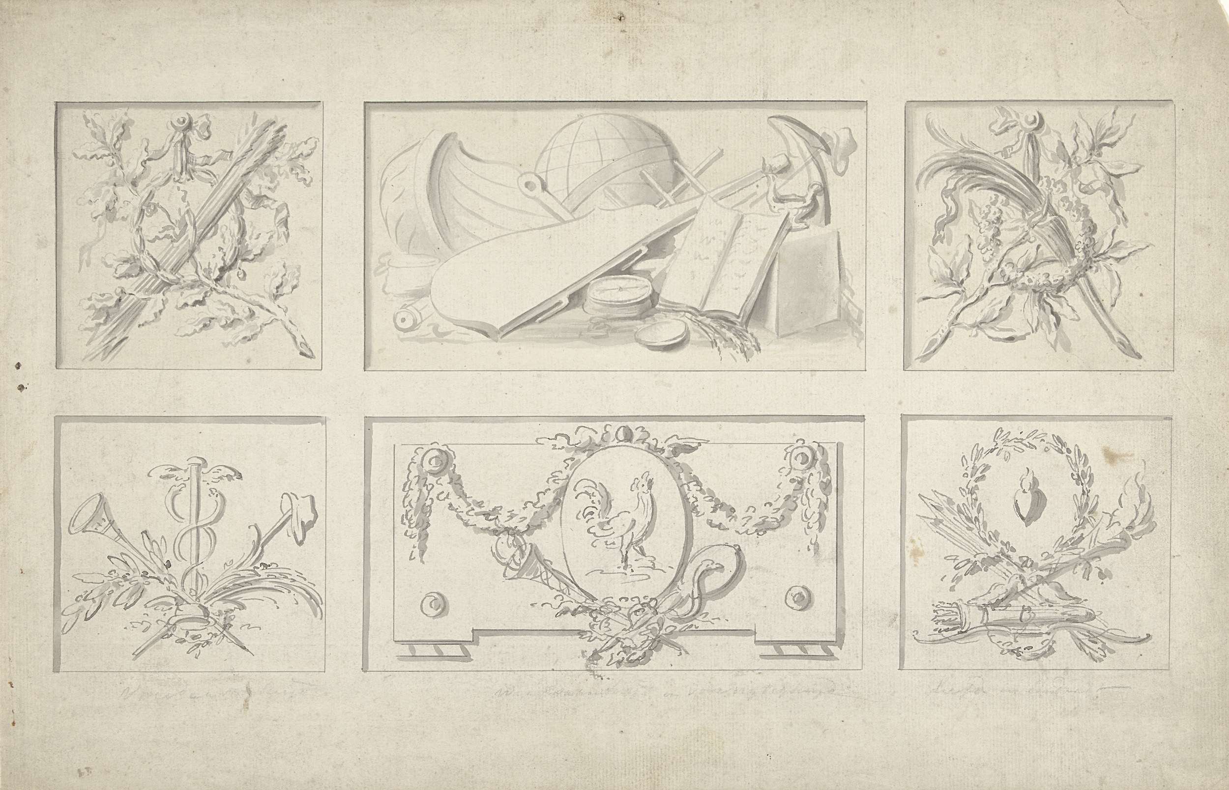 Zes ontwerpen voor paneelvullingen met attributen van Eendracht, Voorzichtigheid, Vreze, Liefde, Waakzaamheid en Vrijheid