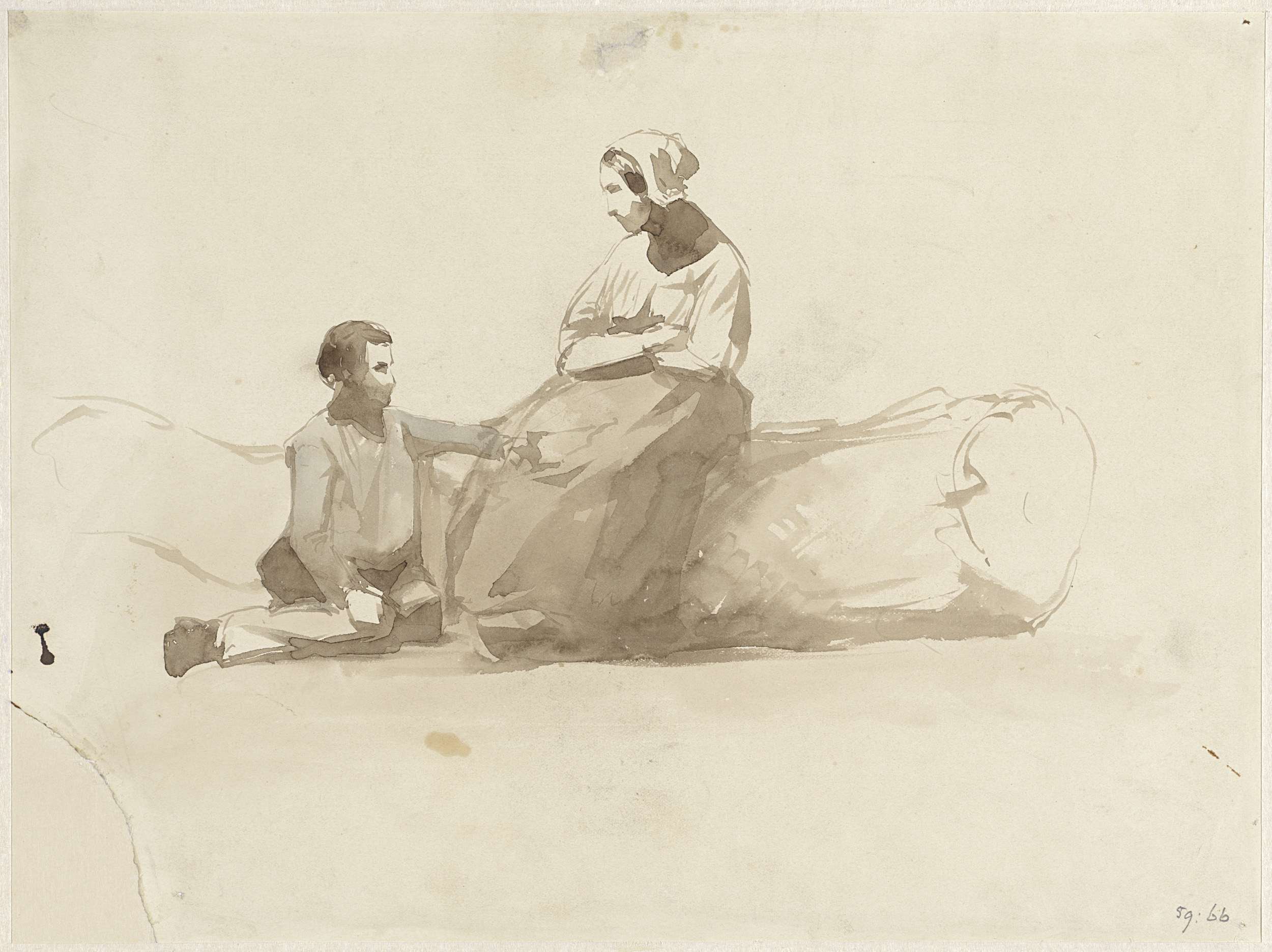 Een vrouw zittend op een boomstam, met naast zich een jongen met een boek op schoot.