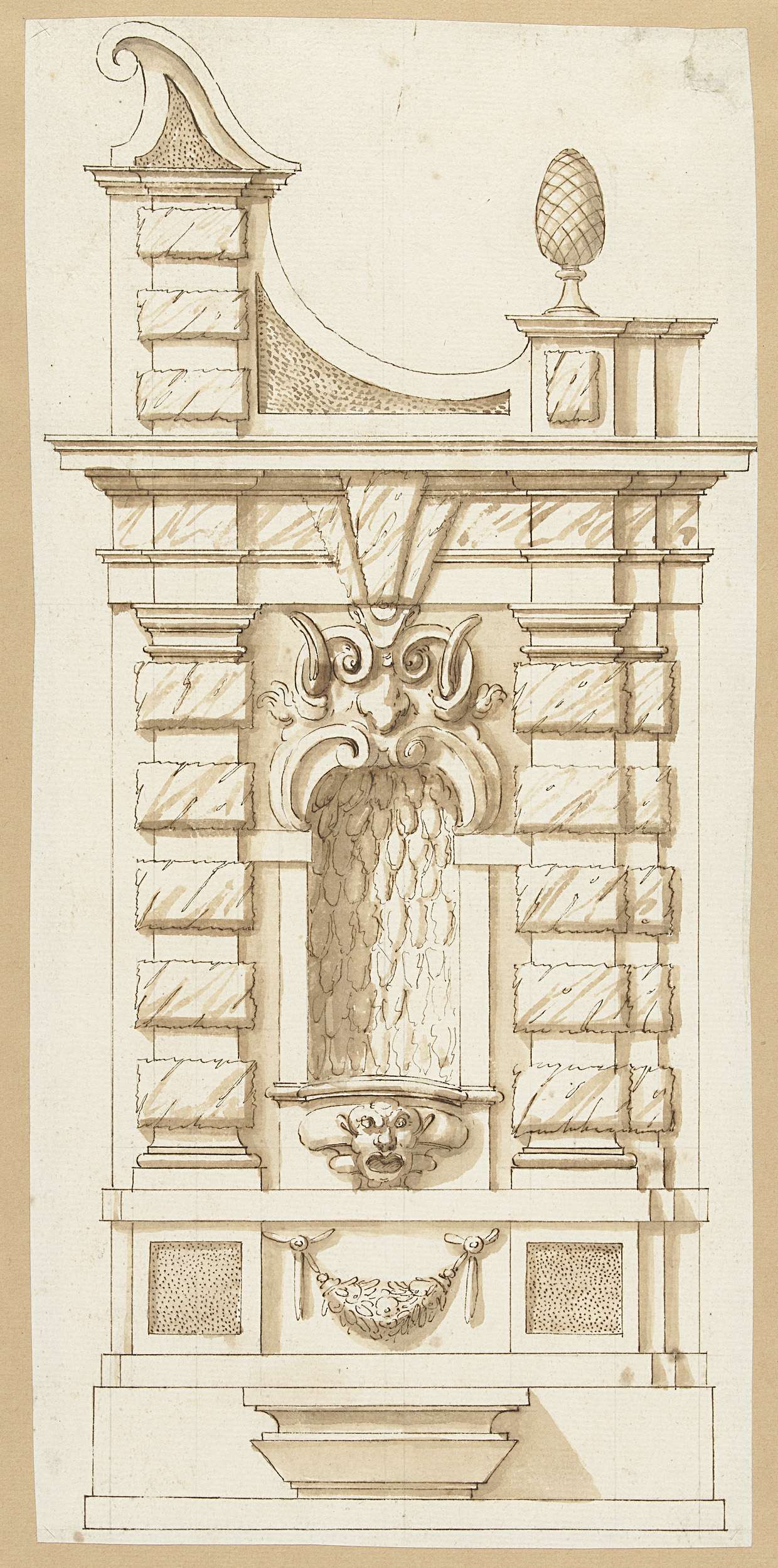 Ontwerp voor een zijde van een ingangspoort met een nis tussen gapende maskers tussen twee pilasters in rustica. Architectuurontwerp.
