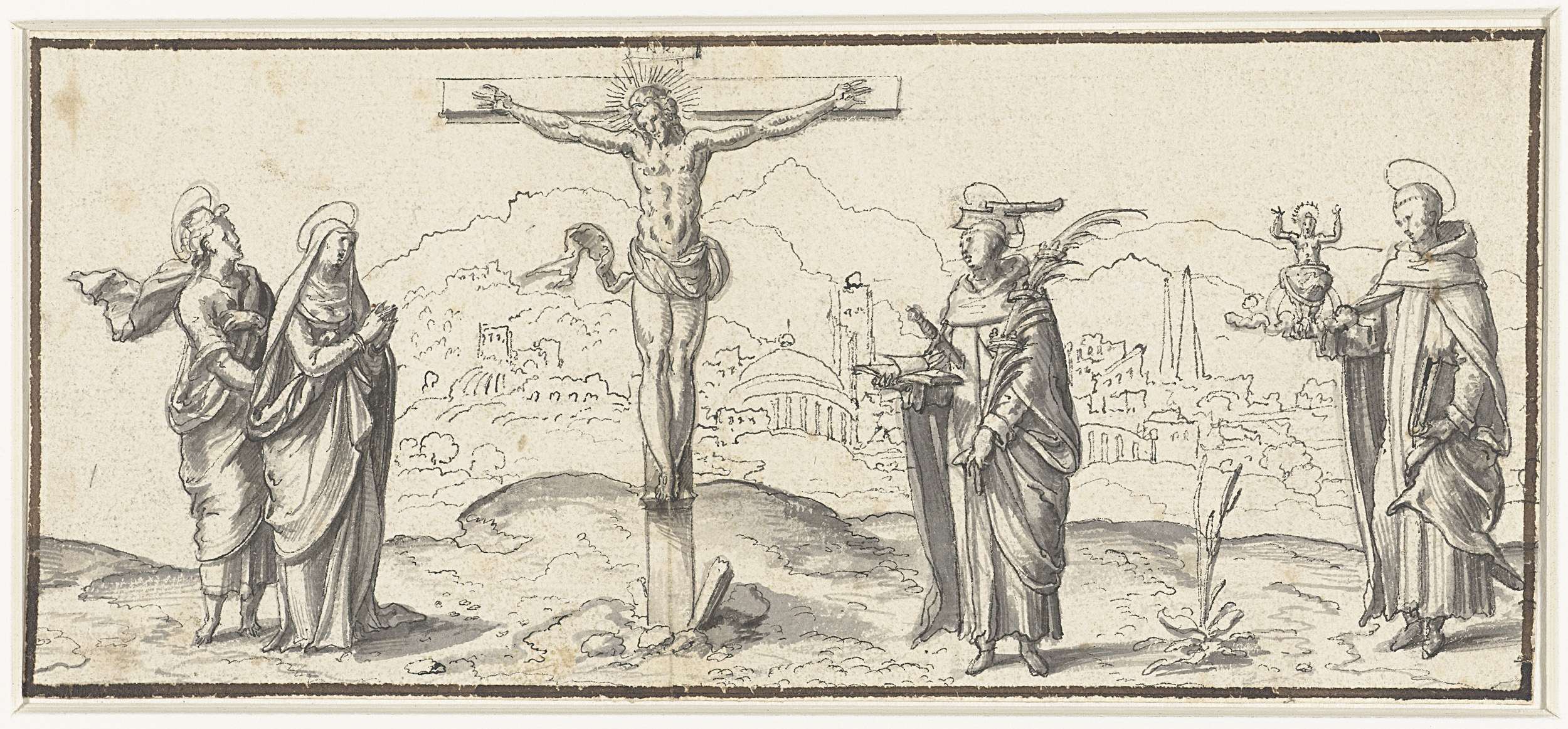 Christus aan het kruis, links Maria en Johannes, rechts H. Petrus Martyr en een onbekende mannelijke heilige.