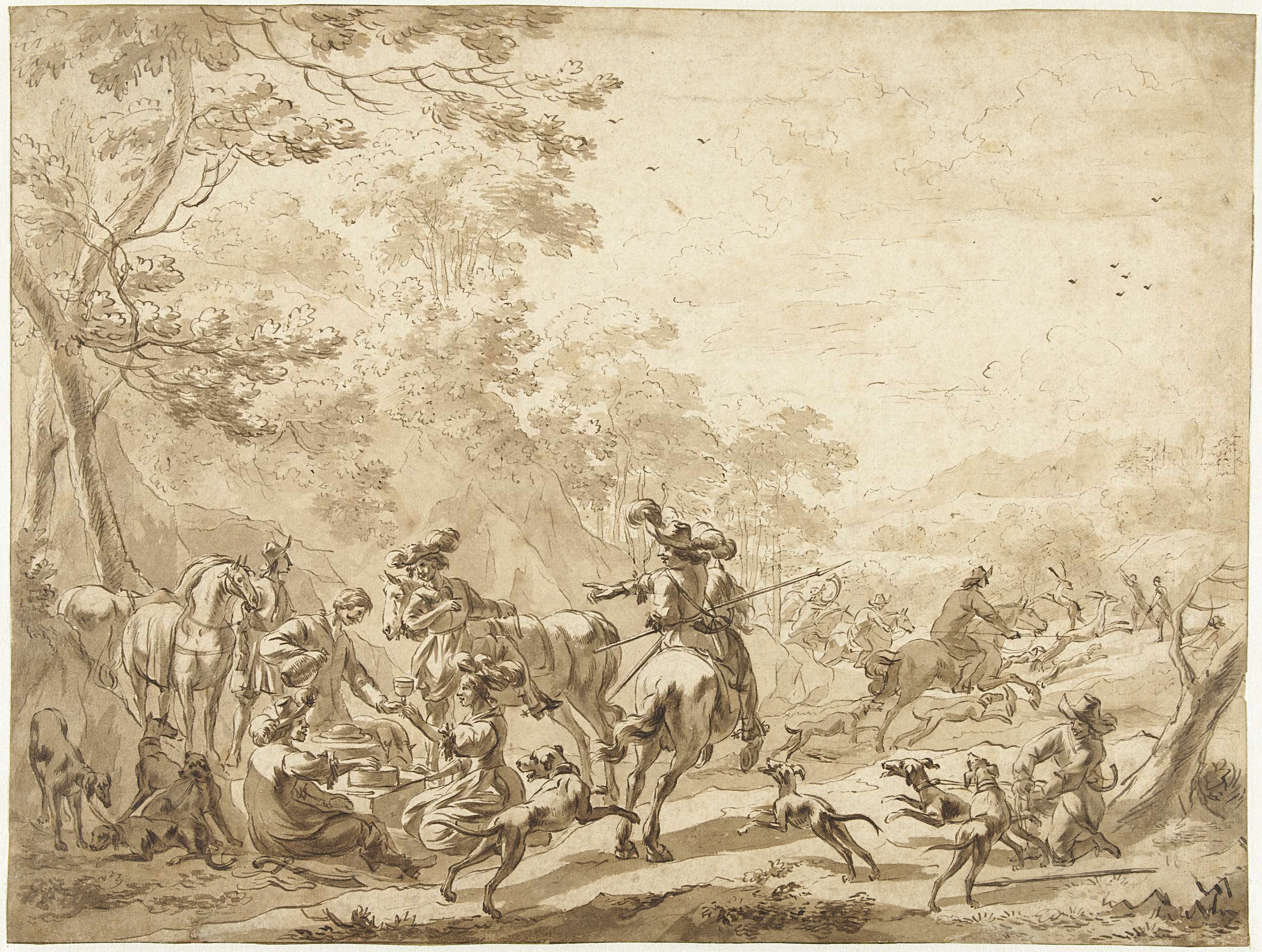 Hertenjacht; links op de voorgrond doet een deel van het gezelschap zich tegoed aan versnaperingen.