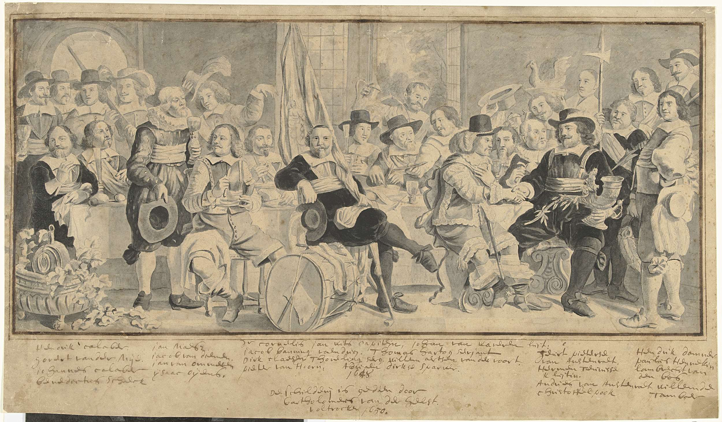 Het schilderij van de schuttersmaaltijd in de Voetboogdoelen of St. Jorisdoelen te Amsterdam ter viering van het sluiten van de vrede van Munster, 18 juni 1648. Voorgesteld zijn: kapitein Cornelis Jansz Witsen (met de zilveren drinkhoorn), luitenant Johan Oetgens van Waveren (die zijn hand schudt), de vaandrig Jacob Banningh (zittend naast de grote trommel), Dirck ...