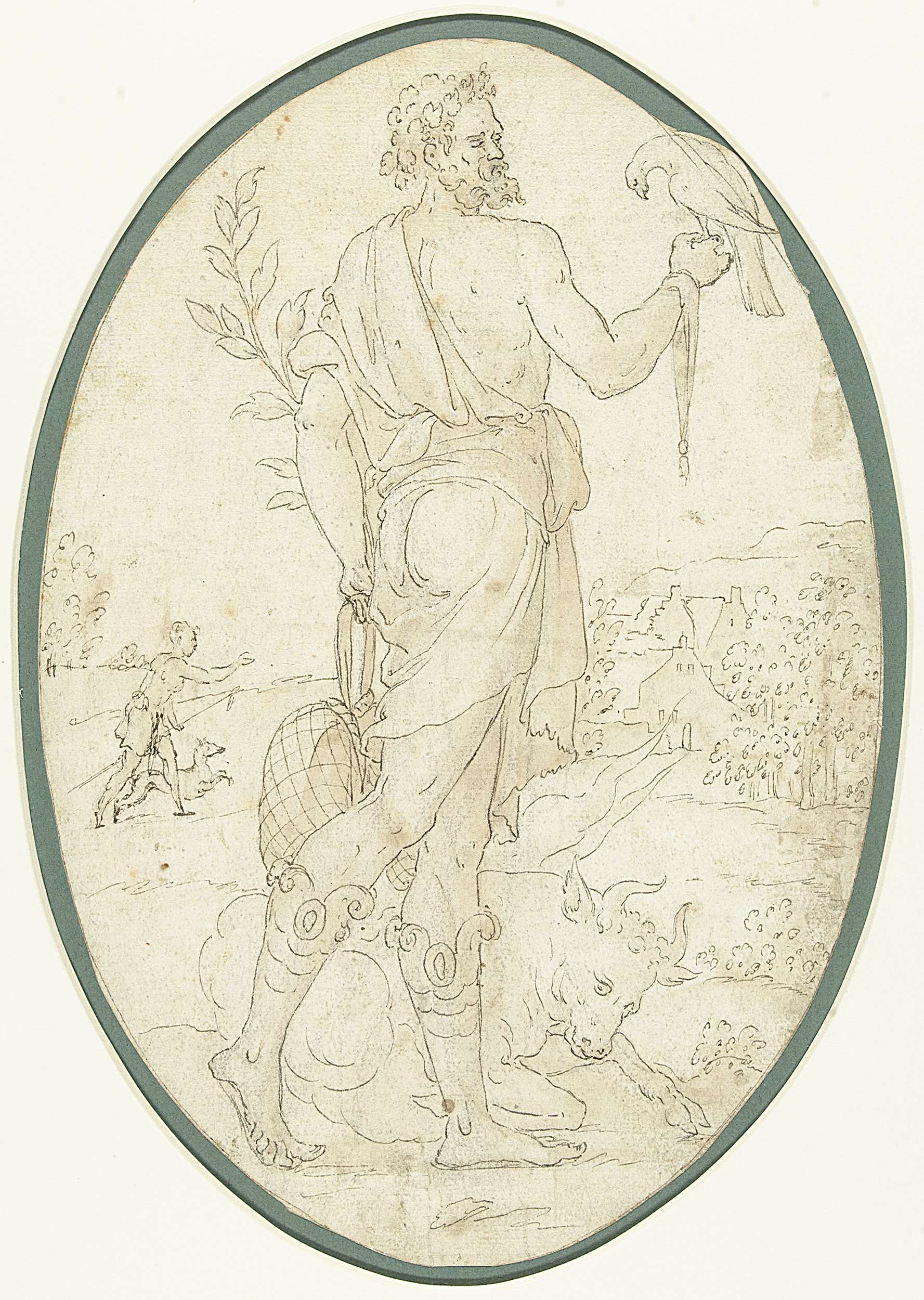 Personificatie van de maand April: staande man met valk op de hand; een stier ligt aan zijn voeten.
