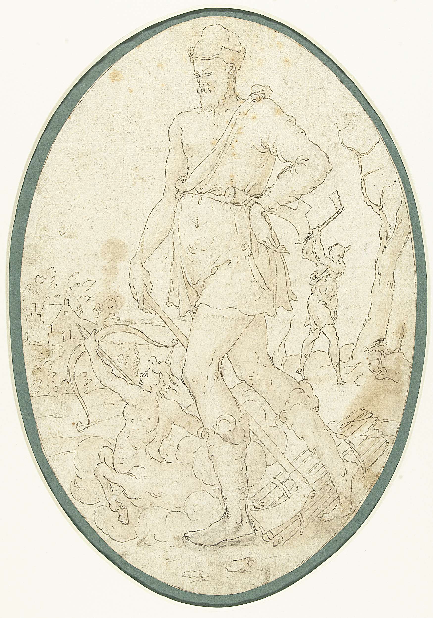 Personificatie van de maand November: naar links lopende man met bijl en met een hakmes in de gordel; voor hem uit gaat de boogschietende centaur.