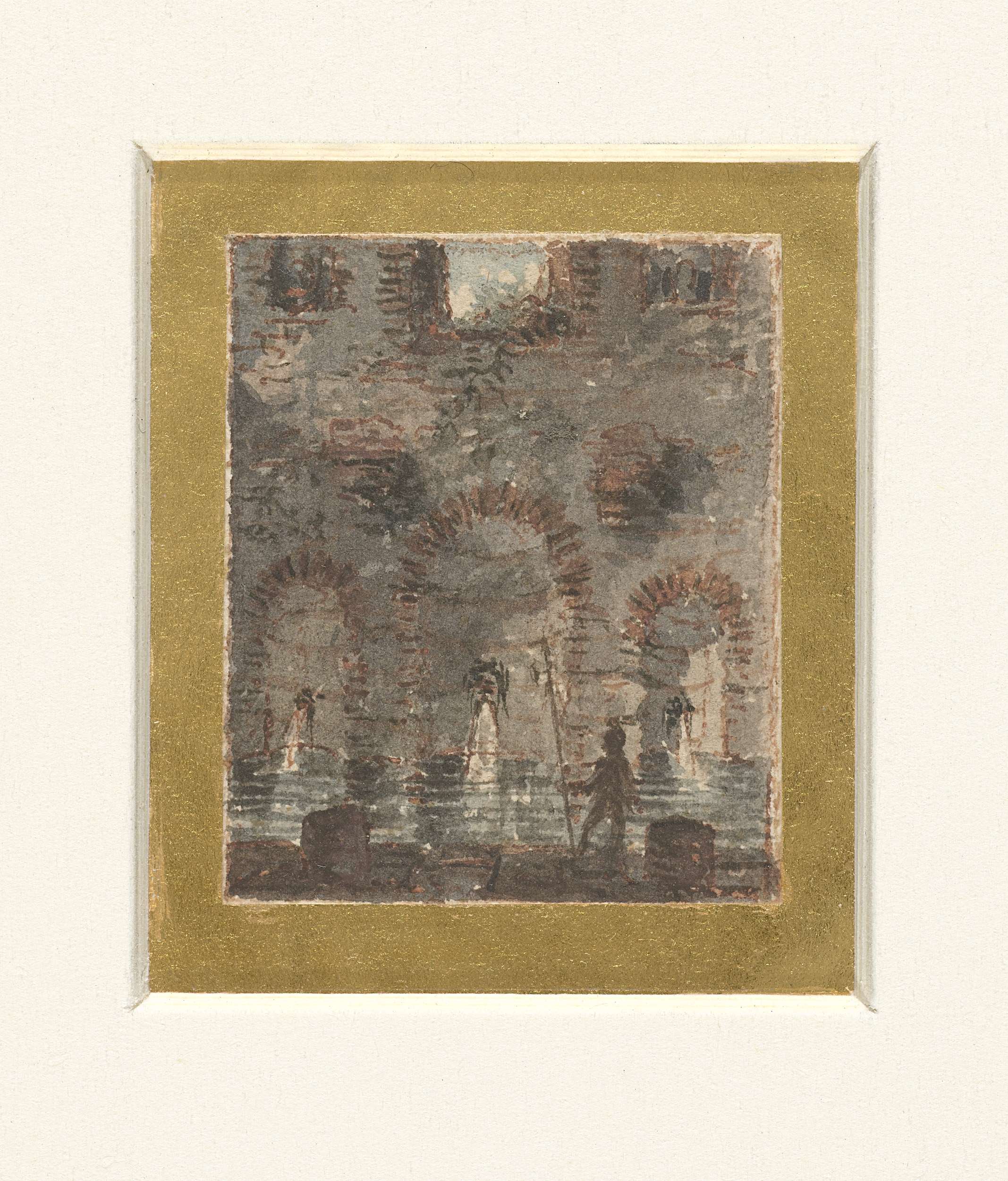 Ruïne van een antiek badhuis (te Rome?), rechts op de voorgrond een krijgsman met lans.