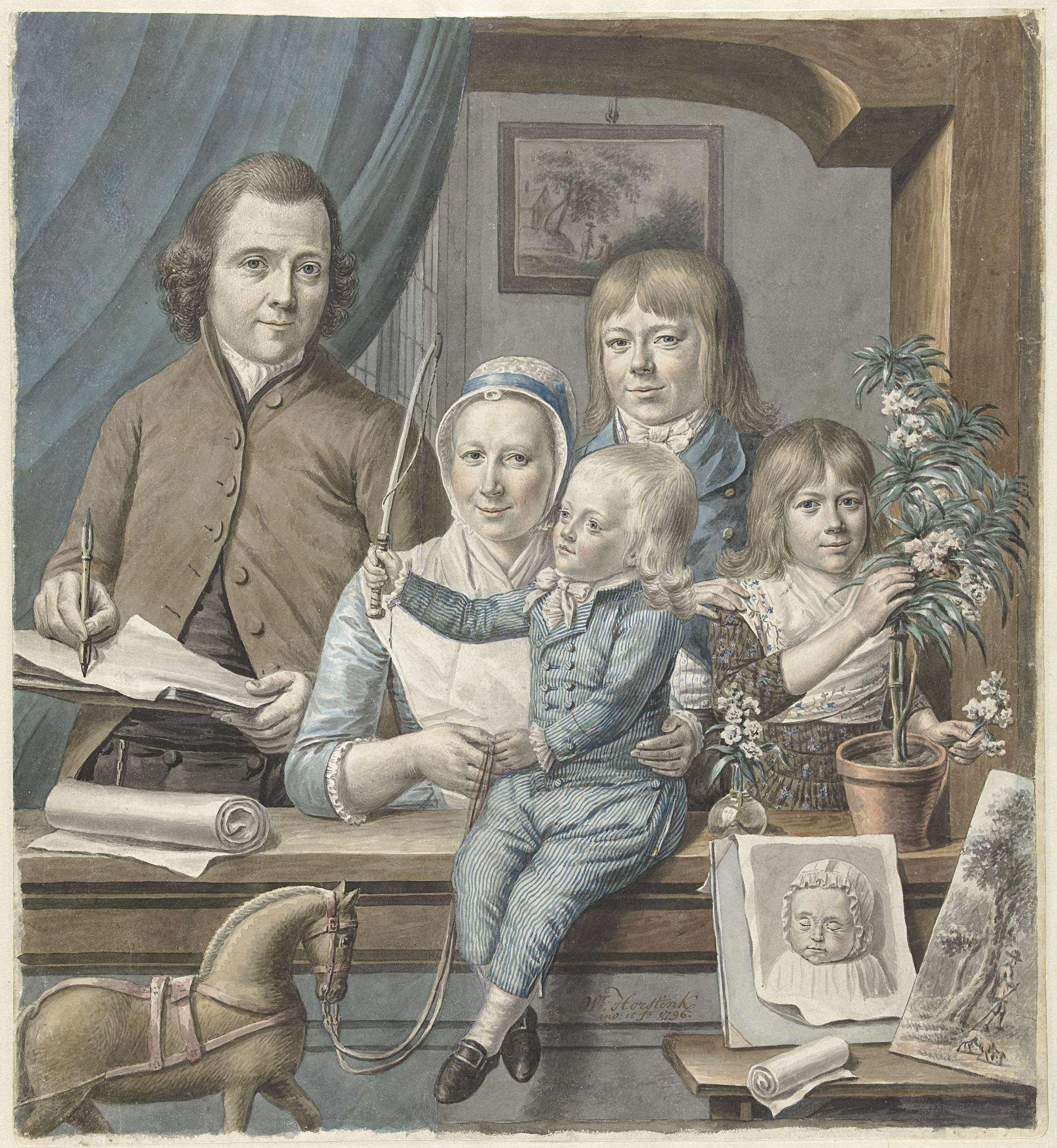 Familieportret van de kunstenaar en zijn gezin, afgebeeld in een vensternis. Horstink staat geheel links, schetsboek en tekenstift in de hand. Naast hem zijn vrouw en een kind in een gestreept pakje, leidsel en paardje vasthoudend. Daarnaast een oudere jongen en, geheel rechts, een meisje bij een plant. Voor haar het getekend portret van een ...