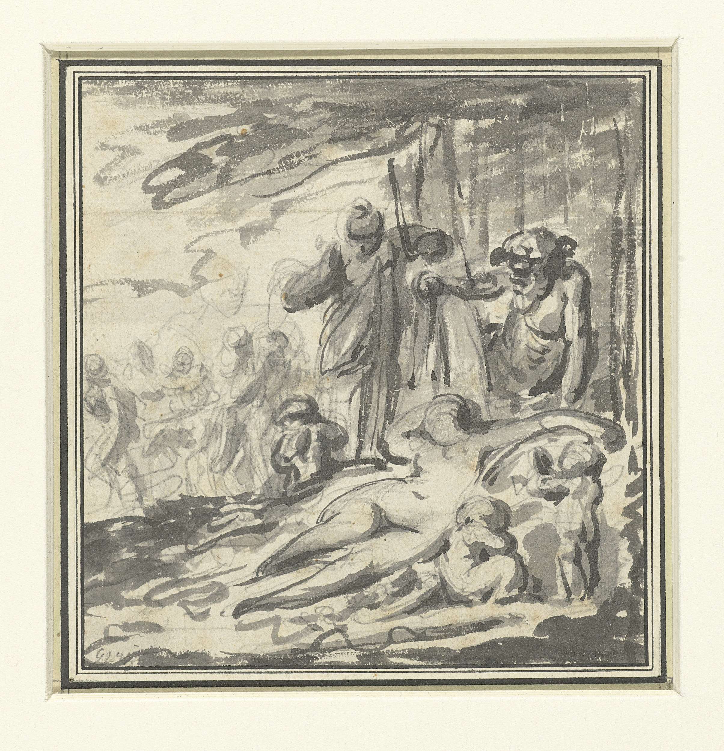 Bacchus tilt een doek op van een slapende naakte vrouw; naast haar staan twee putti.