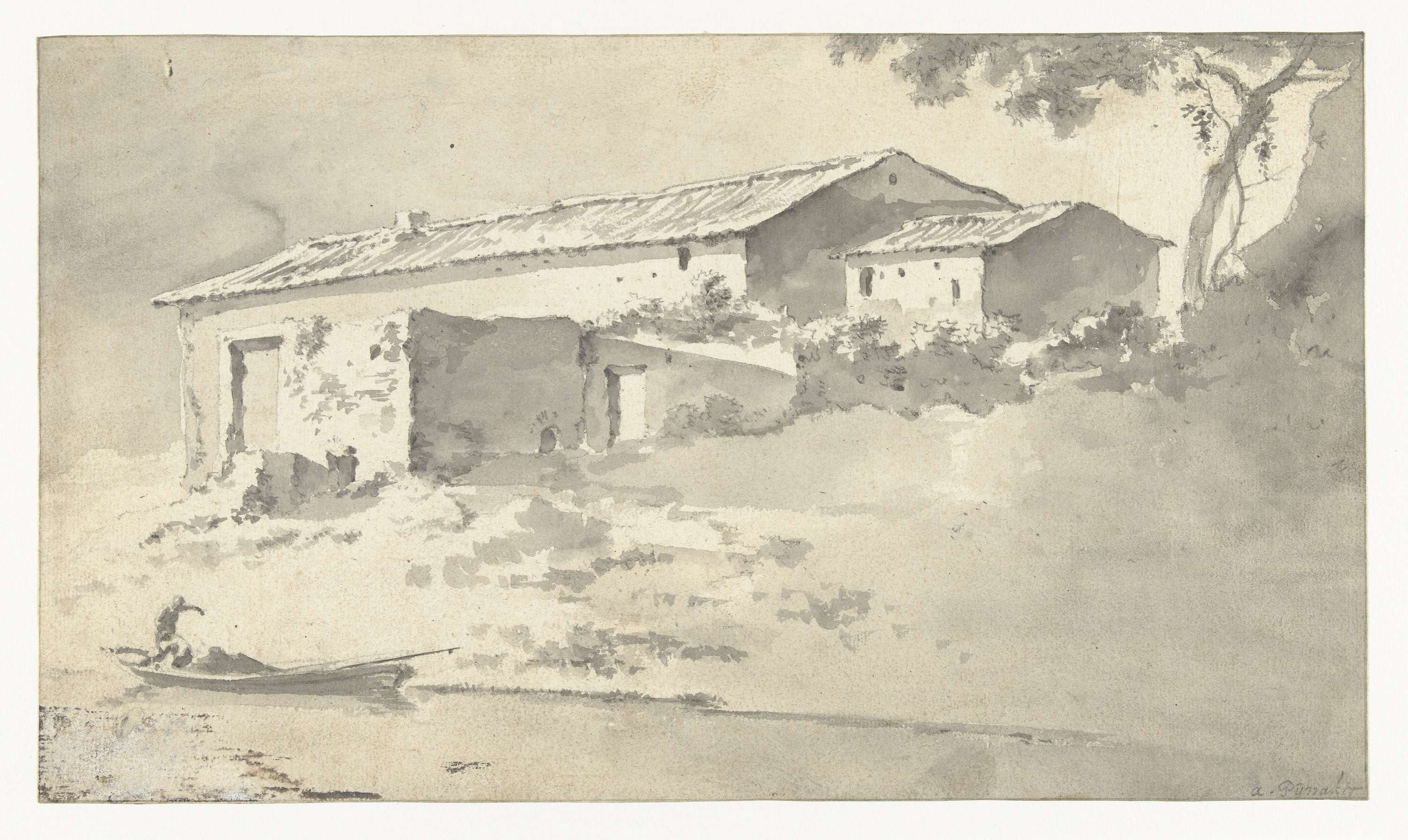 Laag en langgerekt huis aan een rivier, op de voorgrond een bootje.