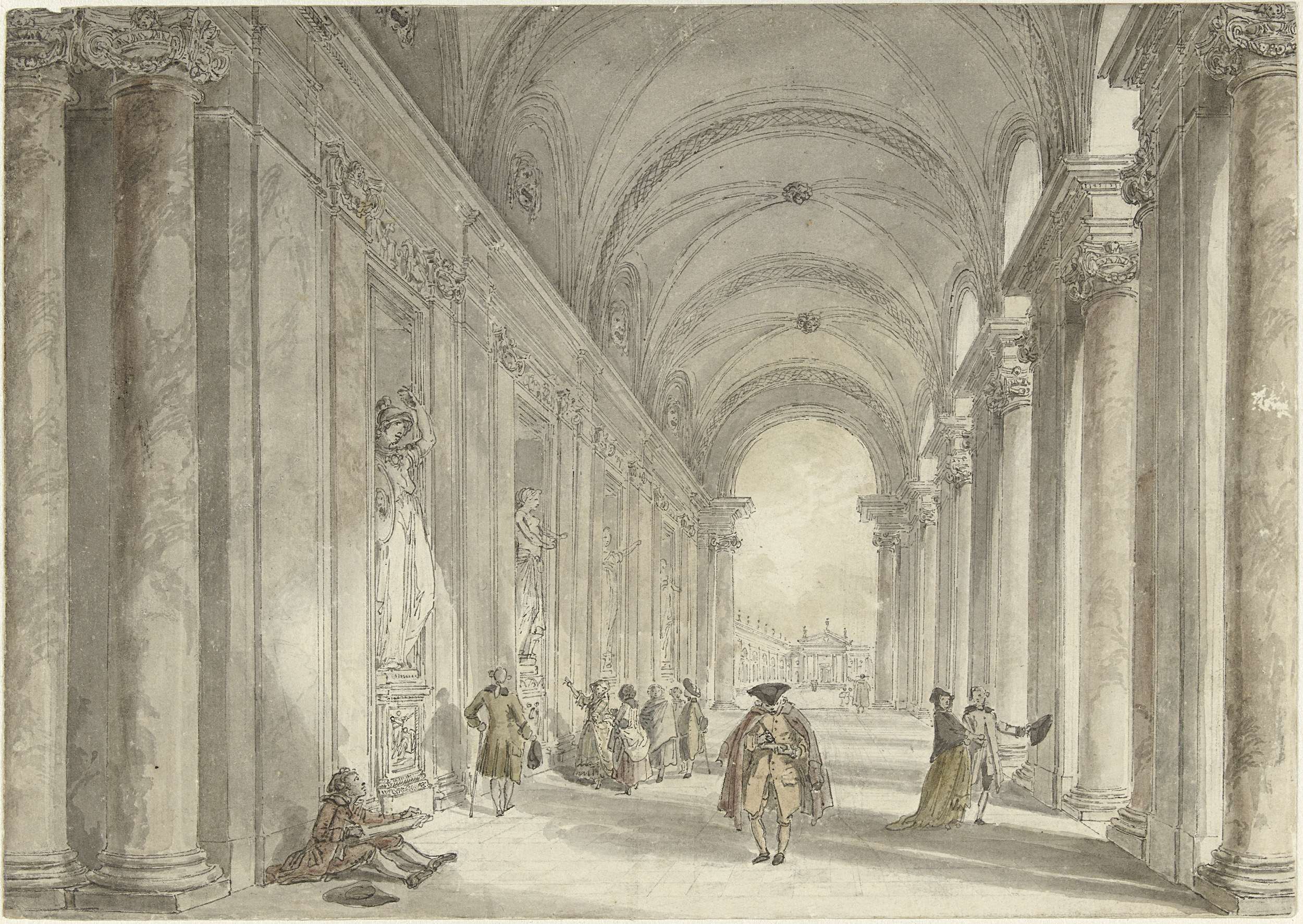 Kardinaal Albini bezat een beroemde collectie beeldhouwwerken uit de oudheid, opgesteld in zijn luxueuze villa. Kunstenaars in opleiding mochten komen tekenen in zijn privémuseum, zoals hier te zien is aan de man links op de grond. De architectuurtekenaar Robert had oog voor detail: zelfs de aders in het marmer zijn te zien. Hij verlevendigde de ...