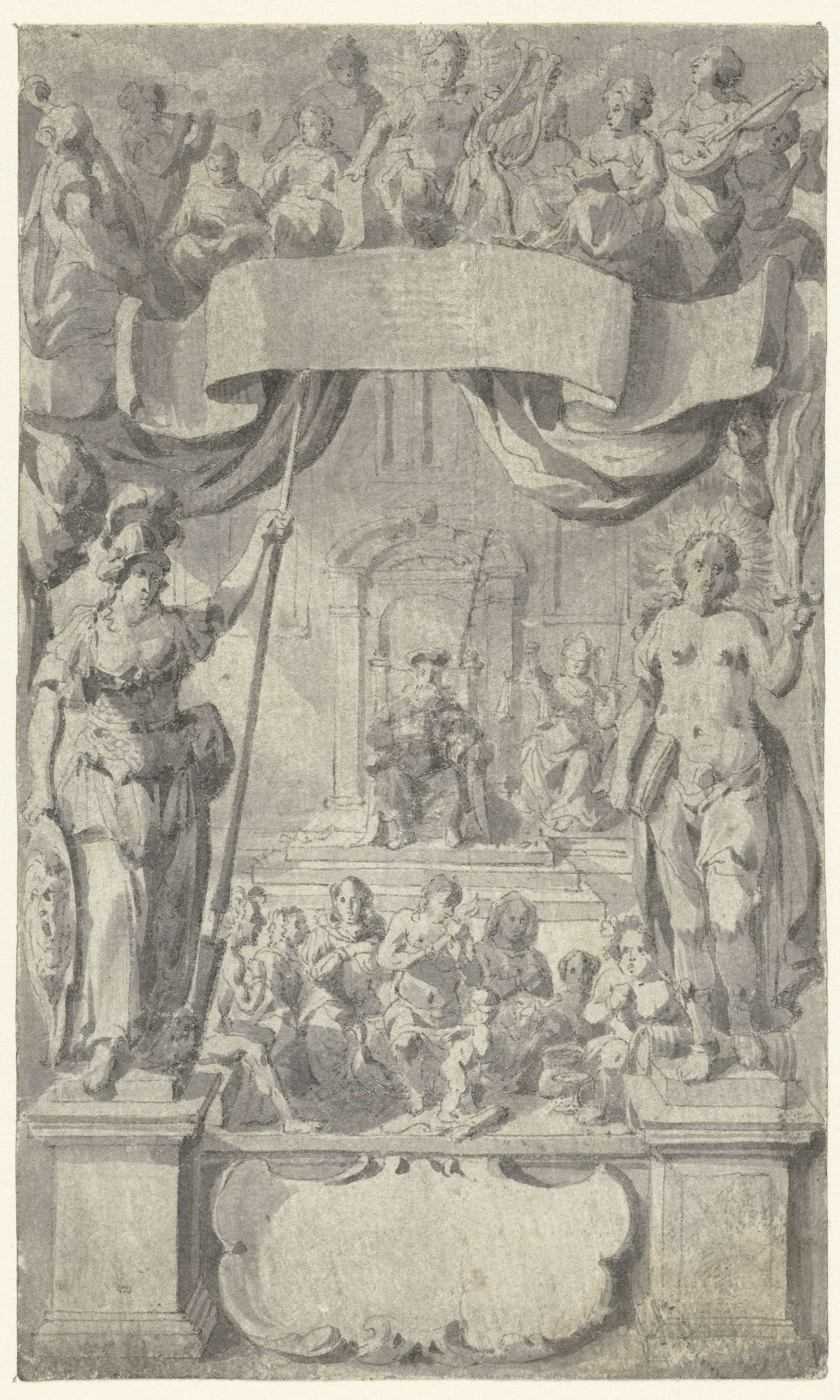 Ontwerp voor een titelblad met op de achtergrond een rechter gezeten op zijn stoel, aan zijn linkerzijde staat Justitia. Op de voorgrond links staat Minerva en rechts een allegorische figuur voorstellende de Goddelijke Straf (?) met een vlammend zwaard. Hiertussen, onder, Charitas, en boven Apollo en musicerende figuren.