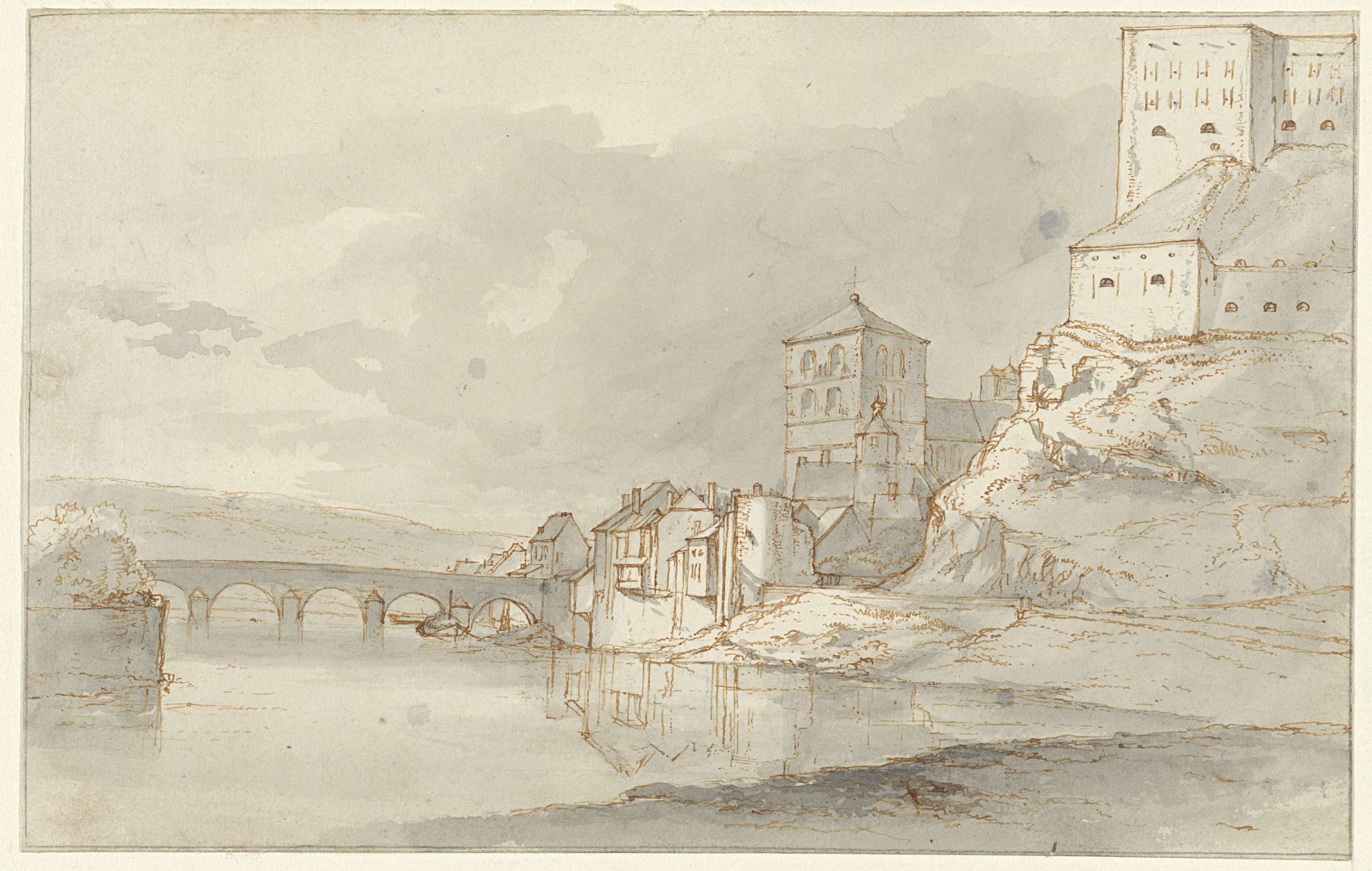 Riviergezicht met boogbrug en fortificaties op de rechteroever