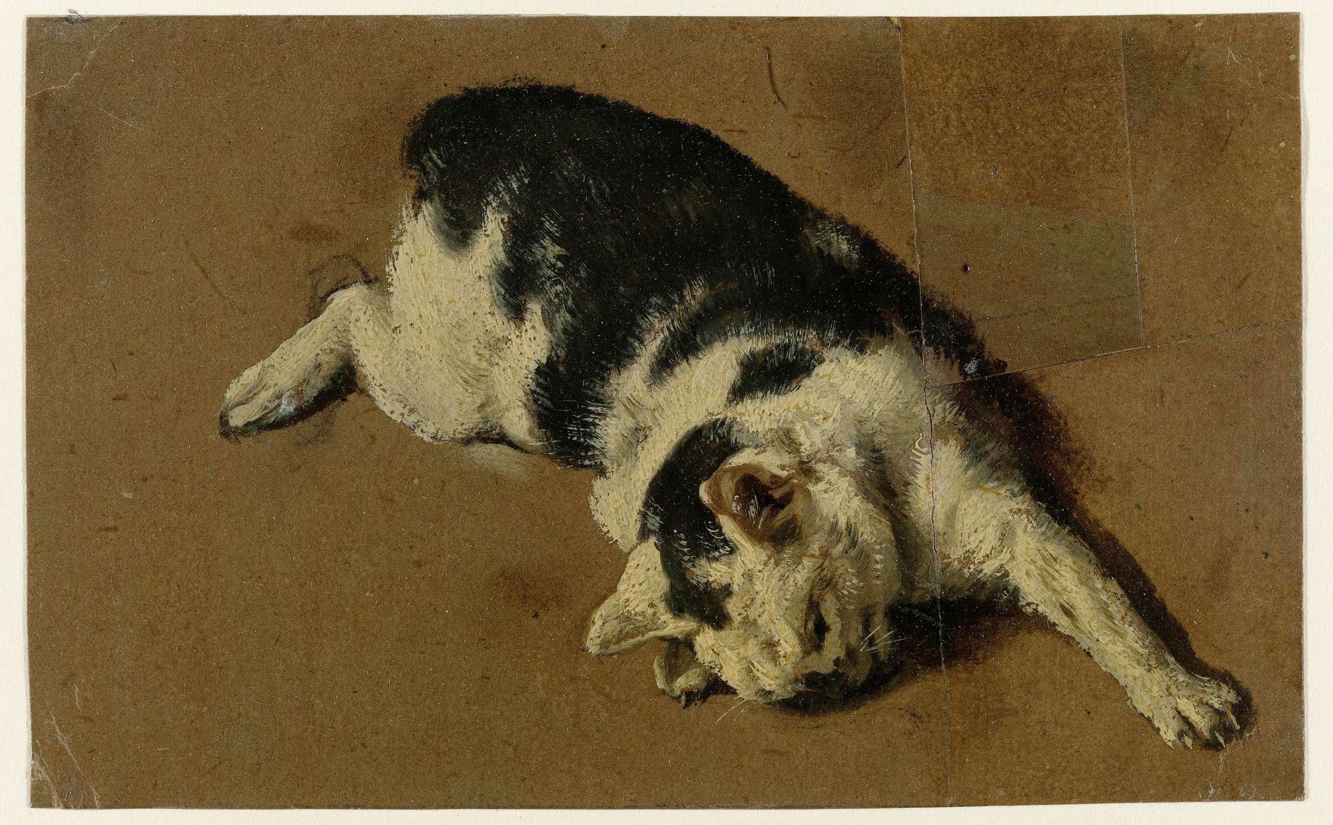 Kat liggend op de zij, de linkervoorpoot uitgestrekt