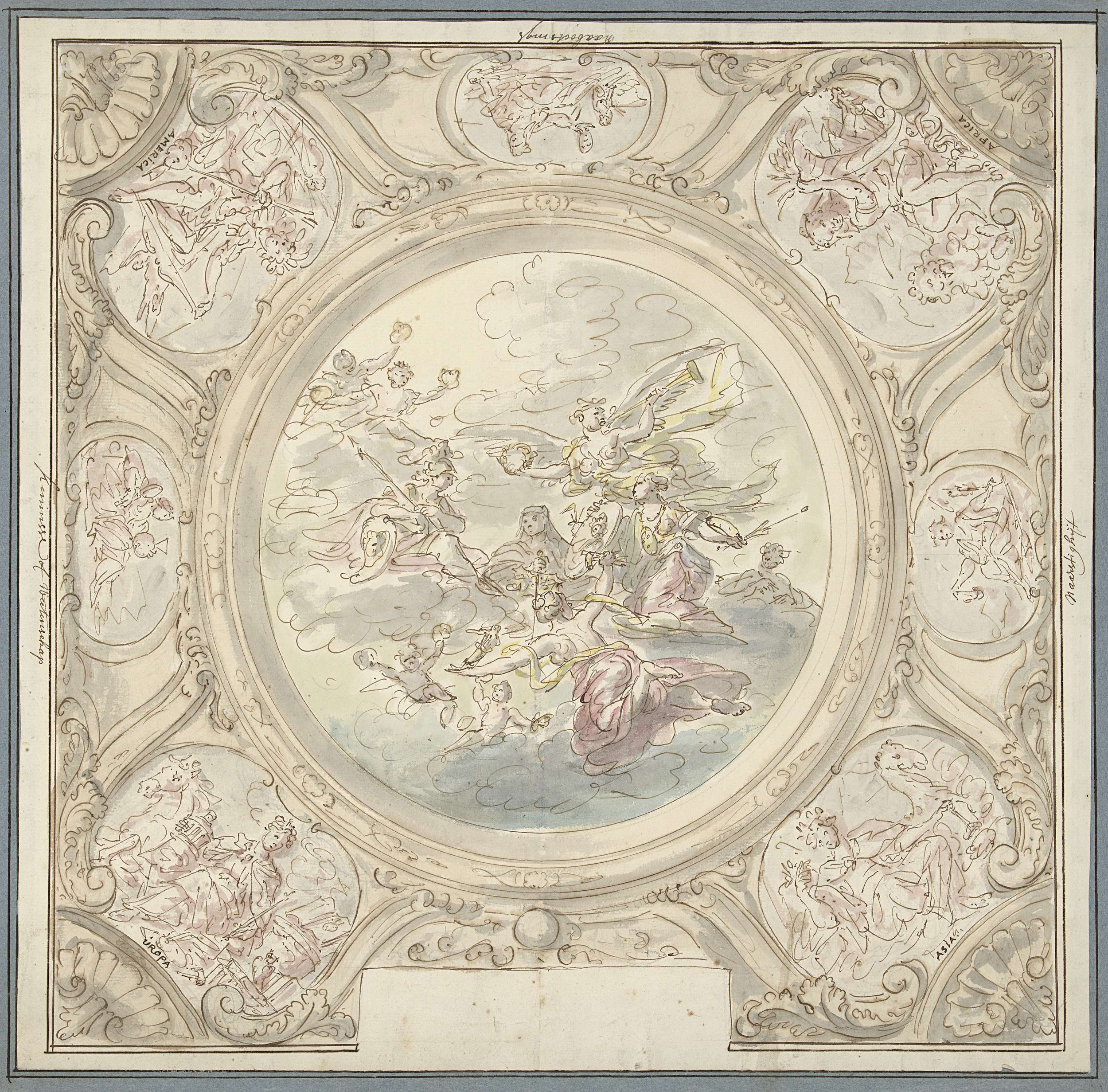 Ontwerp voor een plafondschildering met in het midden een allegorie met Minerva en in de hoeken de vier werelddelen.