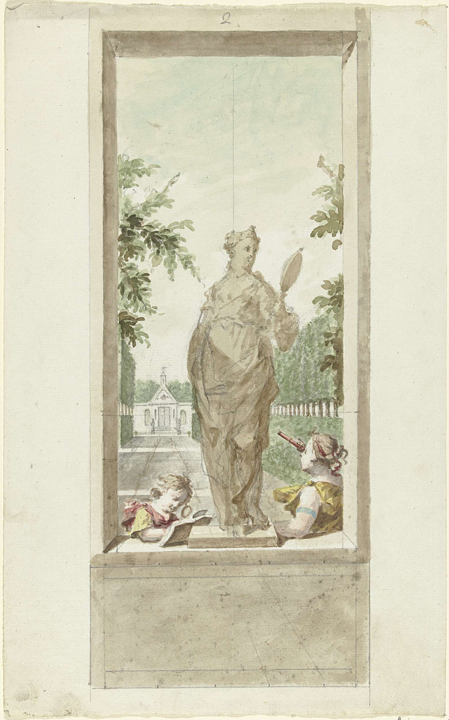 Ontwerp voor een zaalstuk: standbeeld van zintuig Gezicht, daarnaast een jongen met vergrootglas en vrouw met kijker