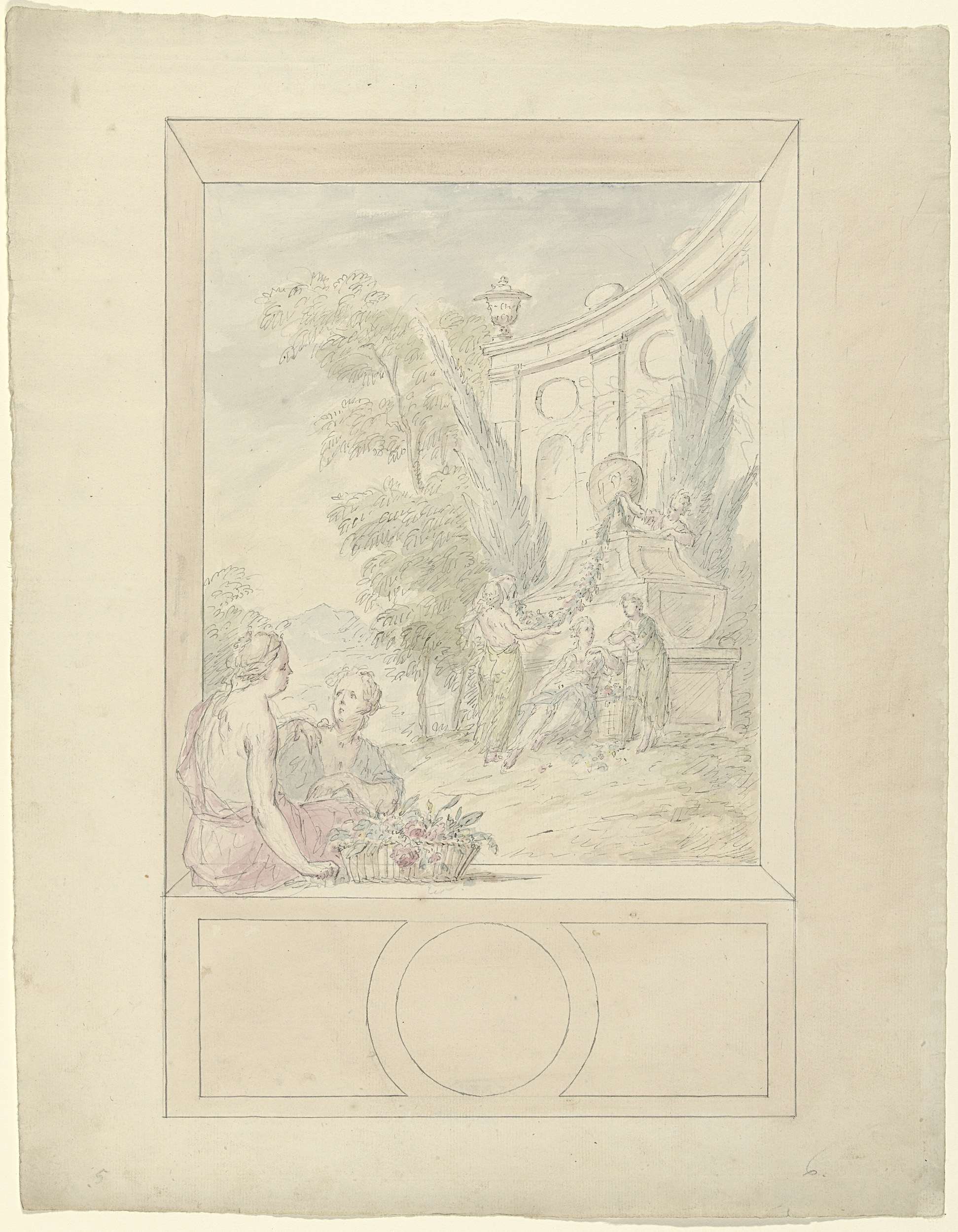 Ontwerp voor een kamerbeschildering met vrouwen zittend in een nis en staande bij een tombe