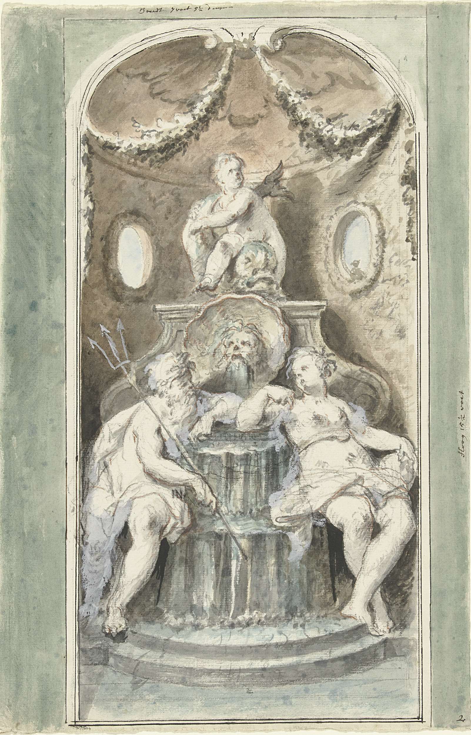 Ontwerp voor een decoratieve schildering met een fontein, die door een triton en een nereïde wordt geflankeerd en bekroond door een jongen met grote vis.