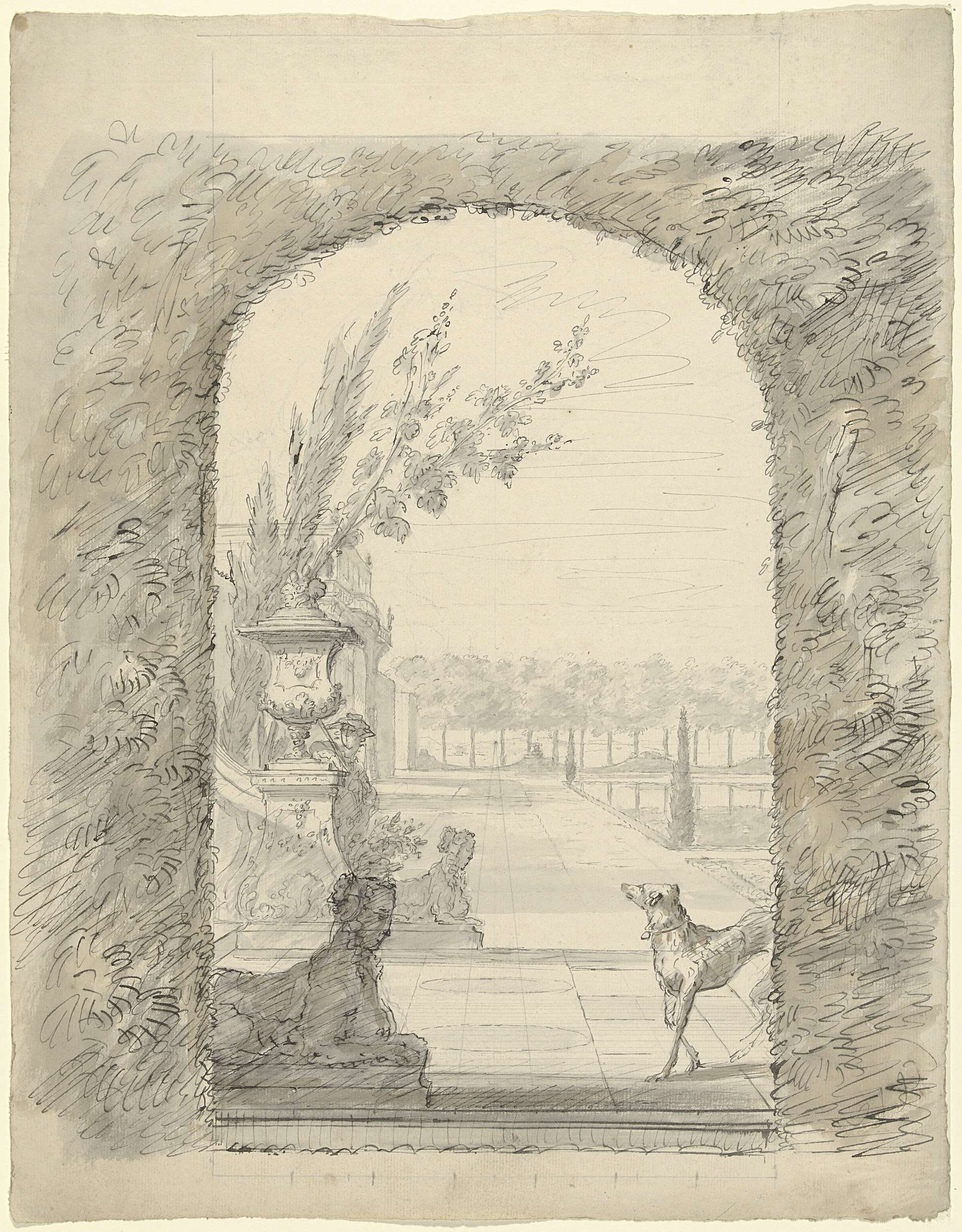 Ontwerp voor een kamerbeschildering met gezicht door een geschoren haag over een terras met sfinxen in een tuin.
