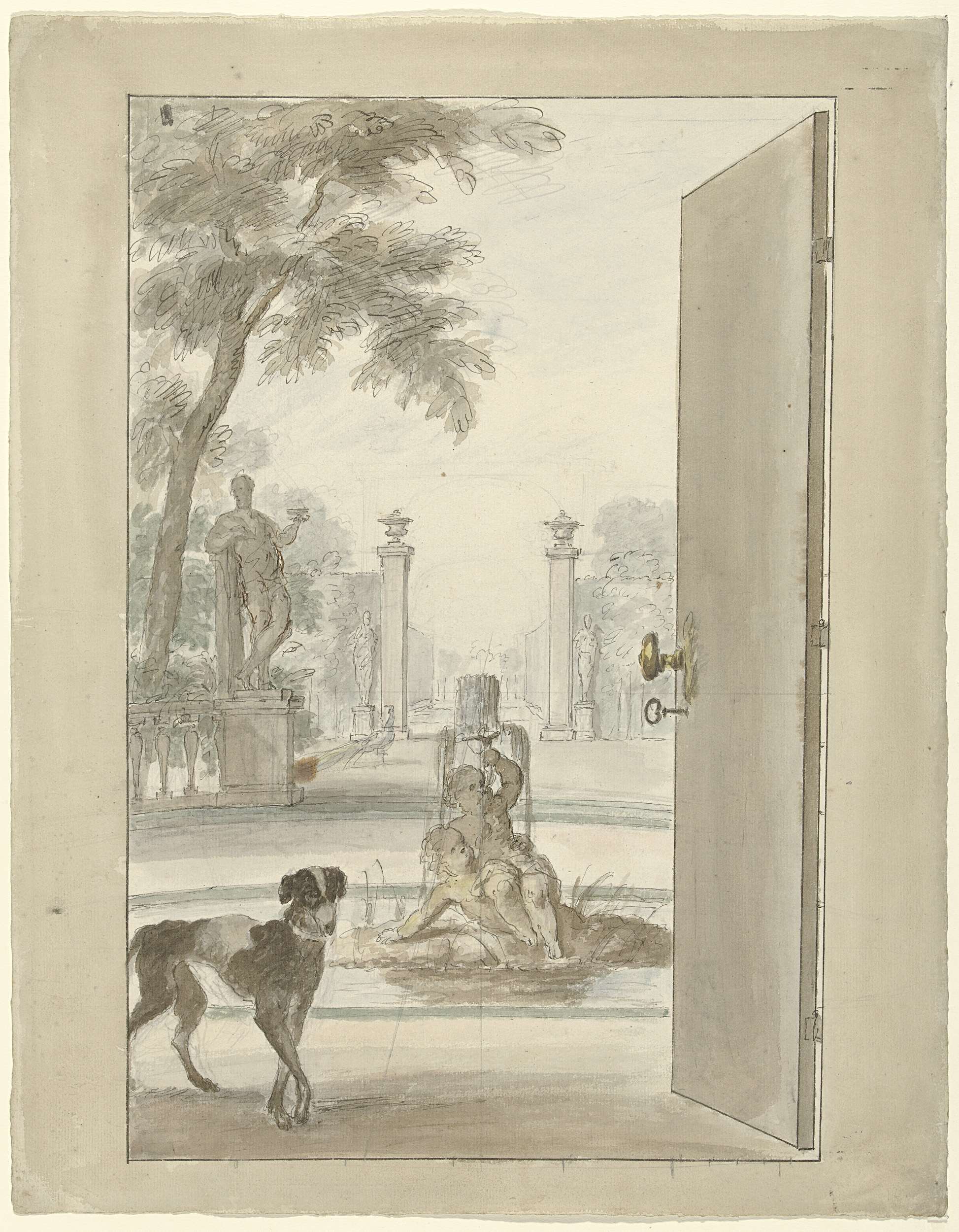 Ontwerp voor een kamerbeschildering: gezicht door een openstaande deur op een fontein in een tuin; bij de deur een hond.