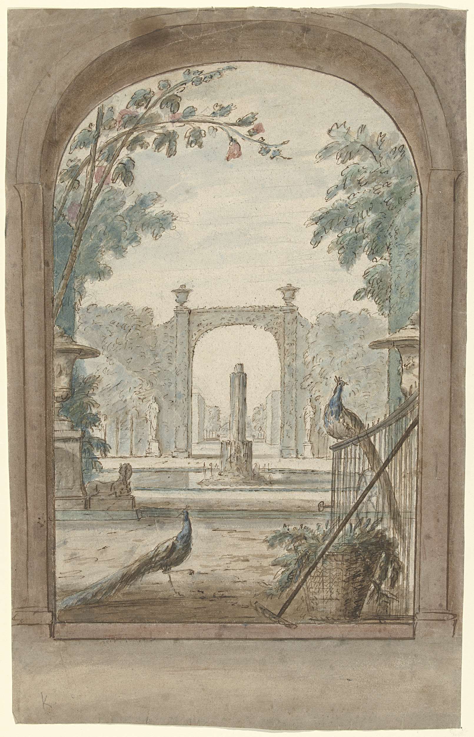 Ontwerp voor een kamerbeschildering met gezicht door een hek op een tuin, pauwen en tuingereedschap