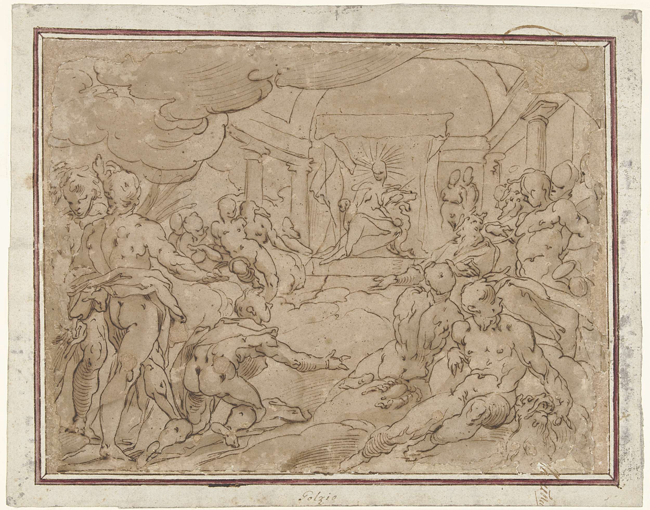 Apollo zit op een troon in de achtergrond. Verschillende Goden zitten en staan op de voorgrond. Tussen hen knielt Phaeton. Op de verso, twee studies van een staande jongen.