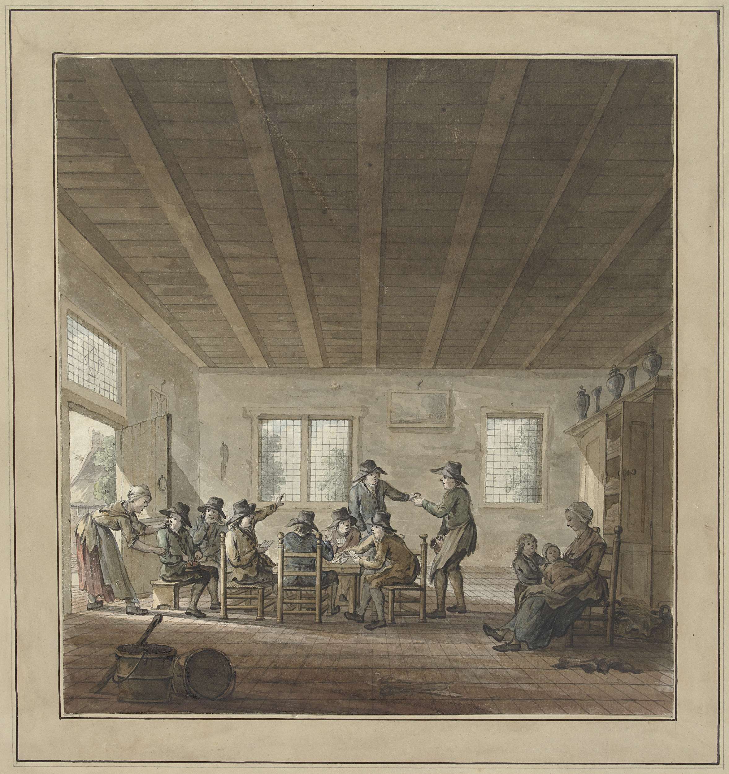 Herberginterieur met een groep kaartende en drinkende boeren