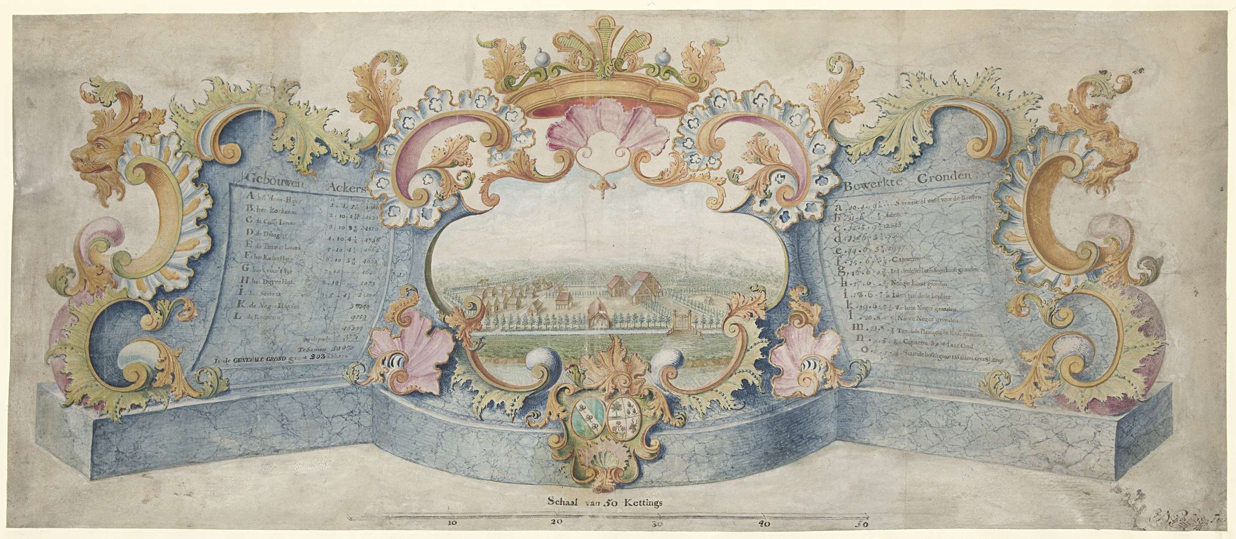 Fragment van een grote kaart van een West-Indische plantage, met verklaring der letters, een overzichtstekening, een alliantiewapen en ornamentaal bijwerk.