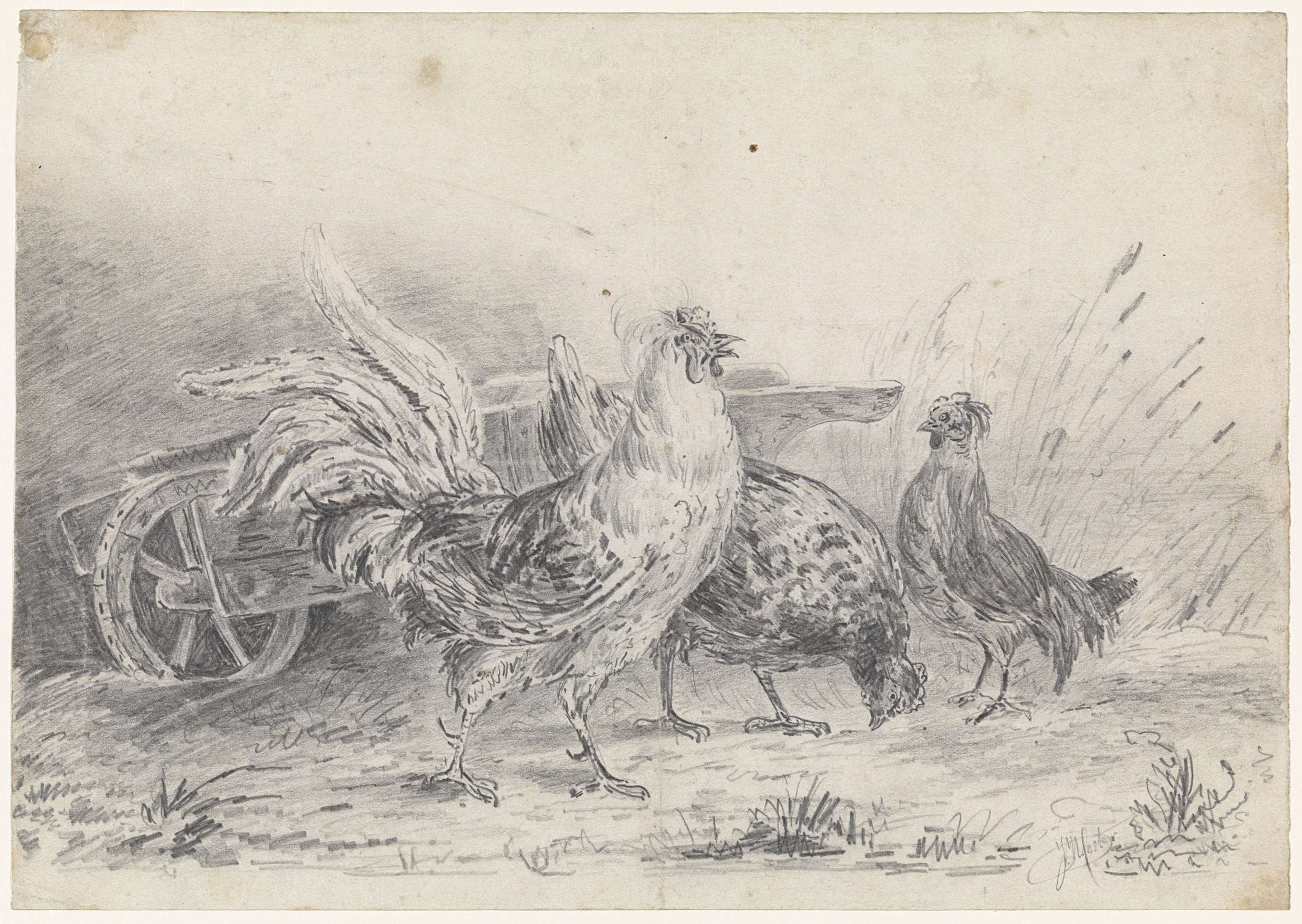 Haan met twee kippen bij een kruiwagen