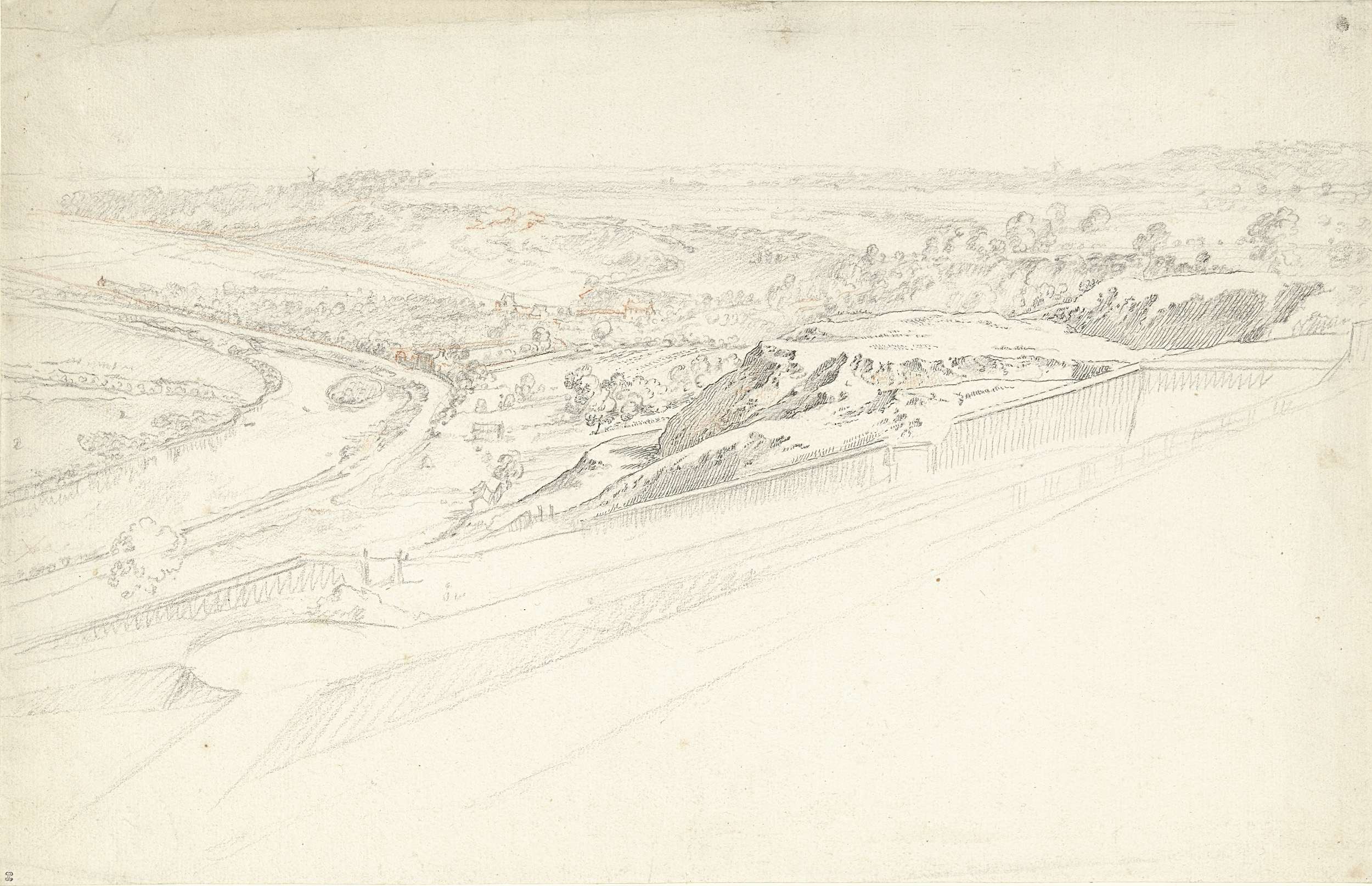 Gezicht van een hooggelegen terras over een landschap met bochtige rivier