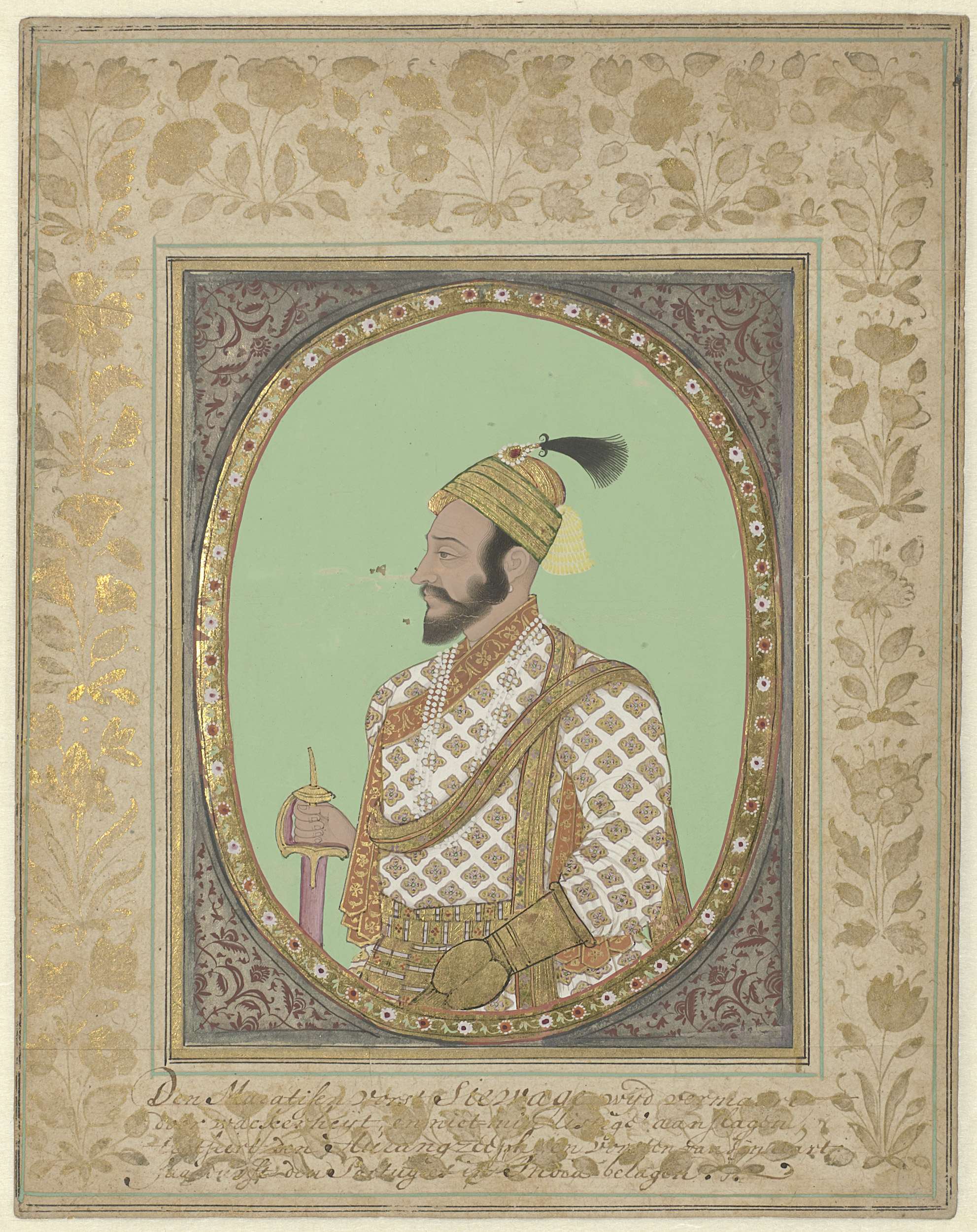 Portret van Maratha vorst Shivaji met uitvoerig Hollands onderschrift op de versierde omlijsting