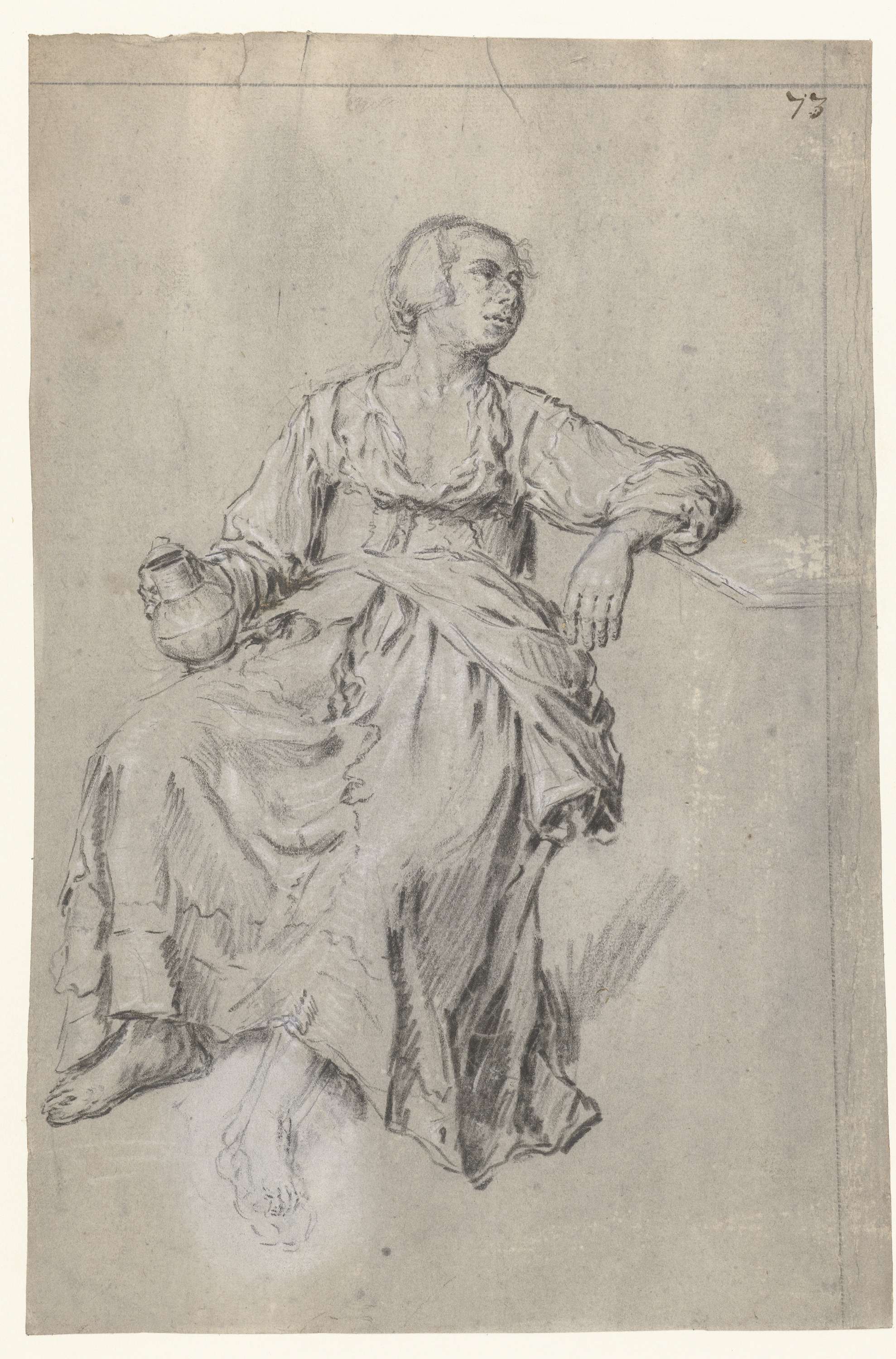 Studie van een zittende vrouw, in de rechterhand een kruik.