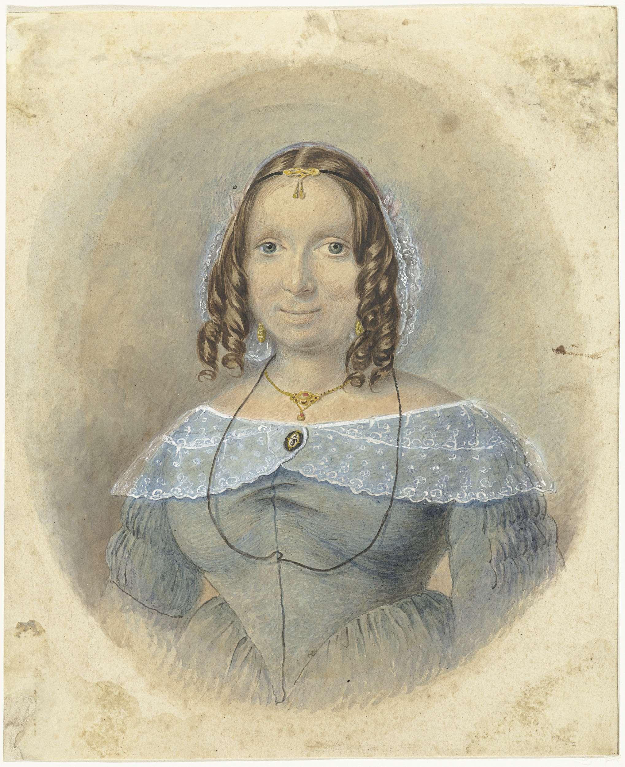Vrouw in een blauwe japon met een kanten schouderkraag