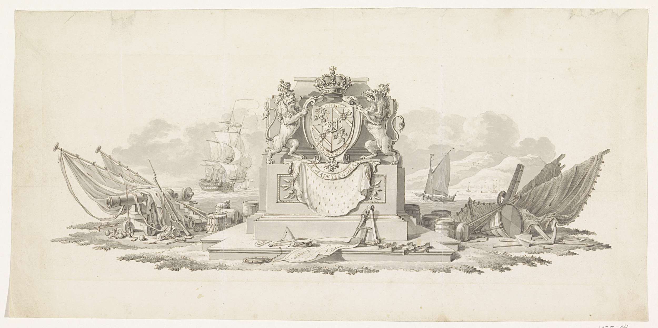 Het wapen van Willem Frederik, prins van Oranje als souverein vorst der Nederlanden op een monument in een omgeving verwijzend naar de zeevaart, 1814. Het wapen samengesteld volgens het Koninklijk Besluit van 14 januari 1814. Kustlandschap met centraal het wapen met koninklijke kroon op een voetstuk. Aan weerszijden van het wapen twee leeuwen met koninklijke ...