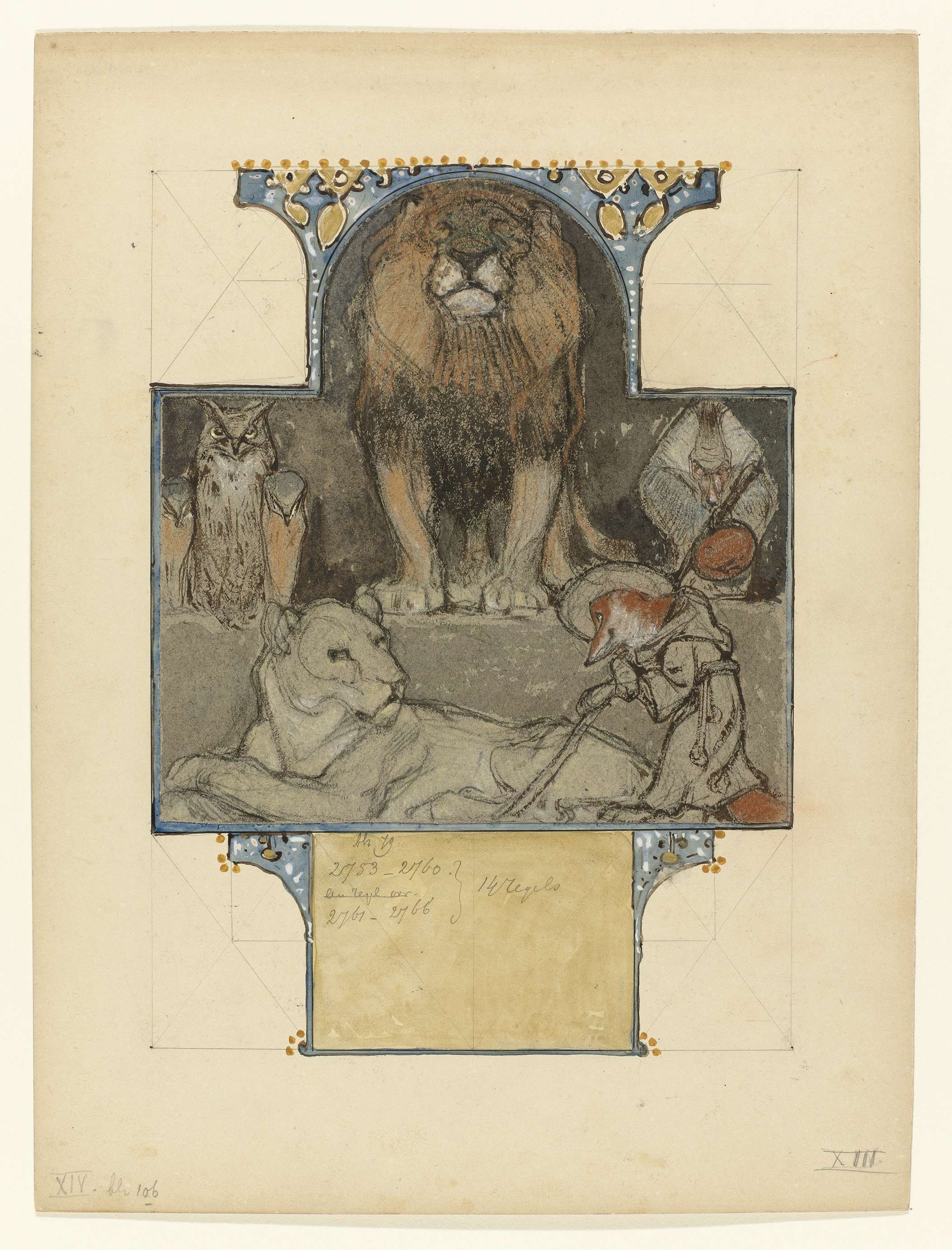 Ontwerp voor illustratie (fol. 12, eerste ontwerp): Van den Vos Reinaerde; Koning Nobel schenkt Reinaert, staande bij de koningin, de vrijheid. Ontwerp voor een prent.